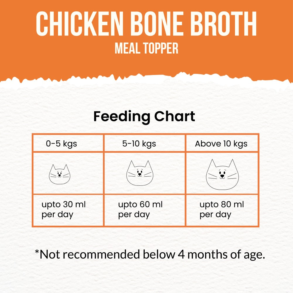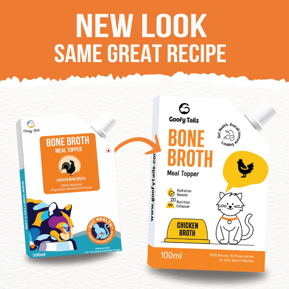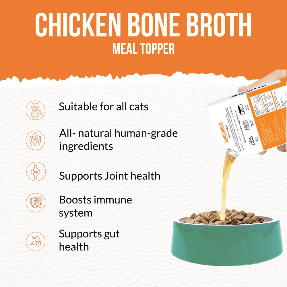 Satisfy your pet’s appetite with delicious chicken bone broth cay food toppers for dry food from Goofy Tails! This exclusive chicken bone broth is an easy, amazing way to transform any meal from ordinary to extraordinary - simply pour the broth over your cat’s next kibble, freeze-dried, or fresh meal, and watch them enjoy the satisfying difference a little bone broth can make. Featuring an exclusive formula, this food topper for cats is made with bones that have been cooked for hours to extract nourishing protein. These cat food gravy toppings for dry food are a natural source of collage that can help boost the quality of your pet’s coat and skin, support your pet’s joints and improve gut health. Your pet will love the delicious flavor of this gravy cat food - and you’ll love the healthy, nutritious benefits with every bite! At Goofy Tails, we know how important it is to make sure your pet eats only high-quality, nutritious food and treats that support their health. Our bone broths for cats are made with 100% human-grade ingredients, and they are made in a human food facility so you can ensure your pet only gets the best. This wholesome cat food broth will transform an ordinary meal into a culinary experience - and your pet will love every bite! Treat your best friend to unbeatable, delicious flavor with the Goofy Tails Bone Broth for cats.