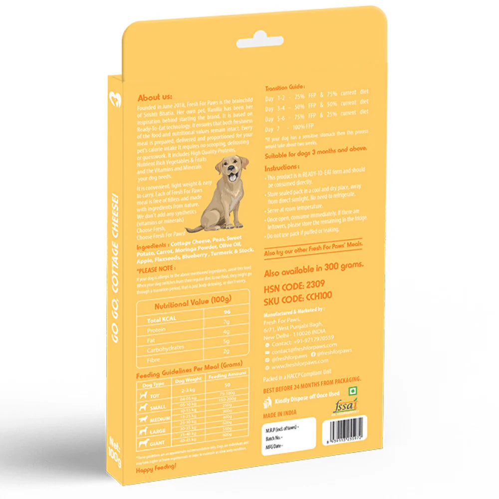 Go, Go, Cottage Cheese is a great source of PROTEIN for vegetarian furry friends. It contains Cottage Cheese, Green Peas, Sweet Potato, Carrots, Moringa Powder, Apples, Flaxseeds, Blueberries, Turmeric & Stock all made together in Olive Oil.