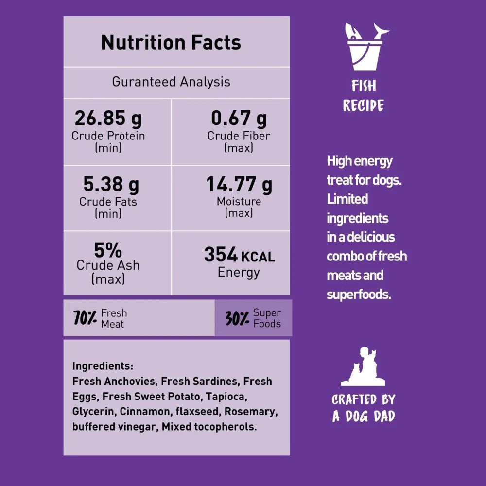 Limited ingredients in a delicious combination of wild caught fish and superfood ensure that your dog gets the benefit of high protein as well as micronutrients. This irresistible treat is 100% natural, grain-free and conveniently pocket-sized. A favorite for both dogs and dog-parents!
