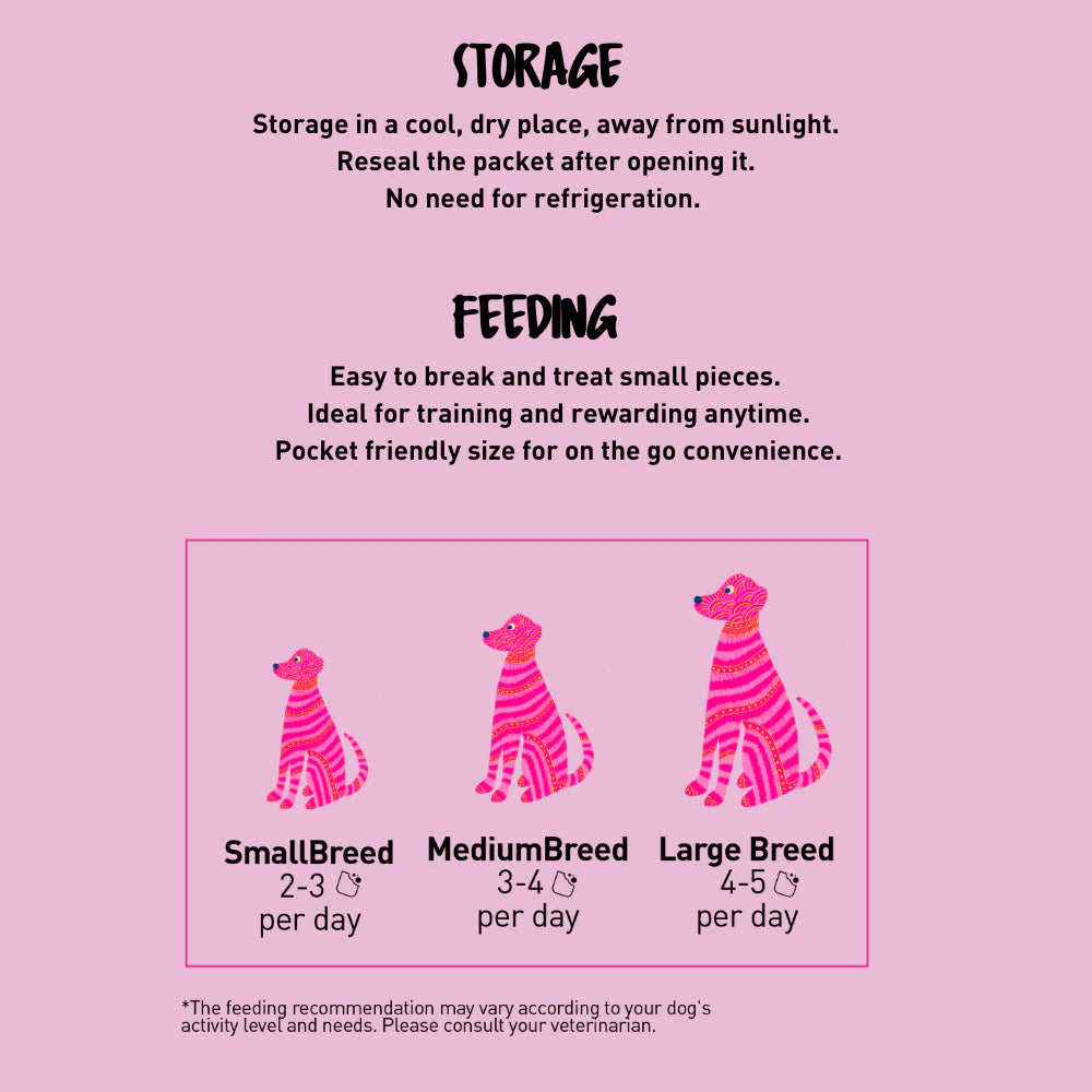 Limited ingredients in a delicious combination of fresh meats and superfood ensure that your dog gets the benefit of high protein as well as micronutrients. This irresistible treat is 100% natural, grain-free and conveniently pocket-sized. A favorite for both dogs and dog-parents!