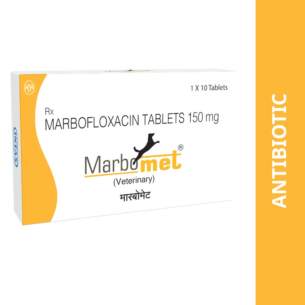 Marbomet tablets contain the most advanced fluoroquinolone marbofloxacin.It is a broad-spectrum bactericidal antibiotic inhibiting bacterial DNA-gyrase. Fluoroquinolones are effective against beta-lactamase-producing bacteria.
