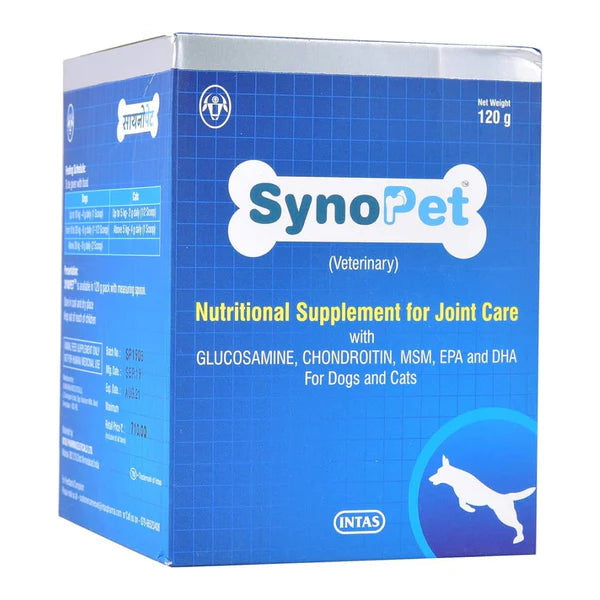 Synopet powder is a nutritional supplement for joint care with Glucosamine, Chondroitin, MSM, EPA, and DHA for dogs and cats.
