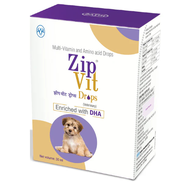Intas ZipVit drops is a multivitamin and amino acid drop for dogs, cats and birds. It is suitable for pups and kittens, nursing or pregnant dogs / cats. It provides essential amino acids, B-complex in a palatable formulation. It supports growth, immunity in young animals and stimulates appetite in anorexic pets. It promotes absolute muscle structure in pets.