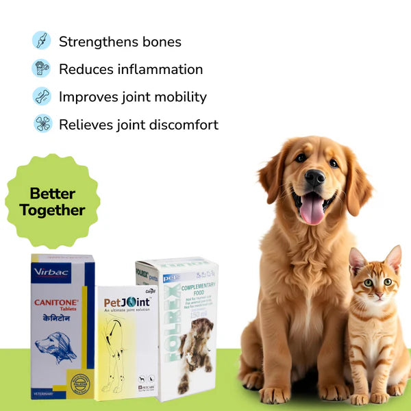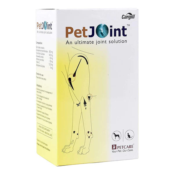 Petcare Pet Joint is a specially formulated supplement designed to support and maintain joint health in dogs and cats. Whether your pet is ageing, suffering from arthritis, or recovering from joint injuries, Pet Joint tablets provide essential nutrients to promote healthy joints, improve mobility, and alleviate discomfort. Each tablet is packed with a powerful blend of ingredients known for their joint-supporting properties, ensuring your pet stays active and comfortable.