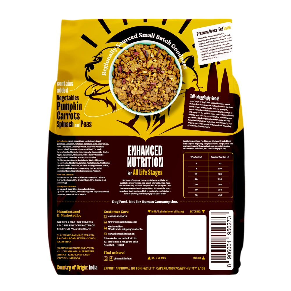 Ingredients: Lamb, Lamb Liver, Lamb Heart, Lamb Cartilage, Lamb Fat, Potatoes, Sorghum, Oats, Brown Rice, Peas, Chickpeas, Chicory Powder, Flaxseed, Pumpkin, Carrot, Mixed Tocopherol, Coconut Meal, Turmeric, Ashwagandha, Moringa, Chia, Spinach, Chamomile, Ginger, Apple, Spearmint, Cinnamon, Citric Acid, Vitamin D3 Supplement, Vitamin A Acetate, L-Carnitine, DL-Methionine, Copper Proteinate, Niacin, Thiamine Mononitrate, Riboflavin, Calcium Pantothenate, Pyridoxine Hydrochloride, Folic Acid, Vitamin B12 Supplement, Biotin, Ascorbic Acid (Vitamin C), Rosemary Extract, Dried Lactobacillus Acidophilus Fermentation Product.