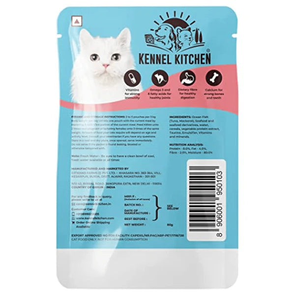 Ocean Fish (Tuna, Mackerel), Seafood and seafood derivatives, water, cereals, vegetable protein extract, Turarine, Emulsifier, Vitamins and minerals.