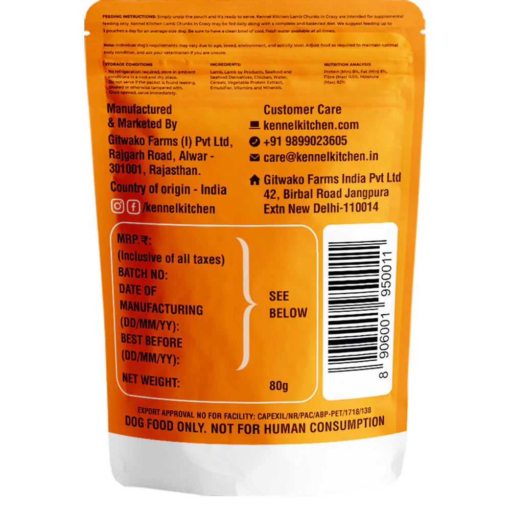 Kennel Kitchen Lamb Chunks in Gravy is made with 100% natural deboned lamb. Tasty gravy covered lamb chunks made with the perfect balance of protein to fat ration to maintain lean and strong bodies.