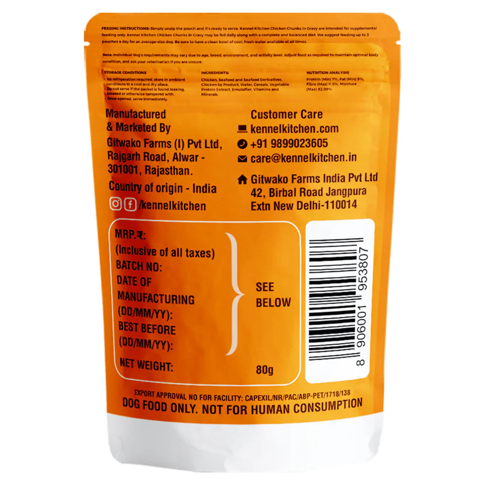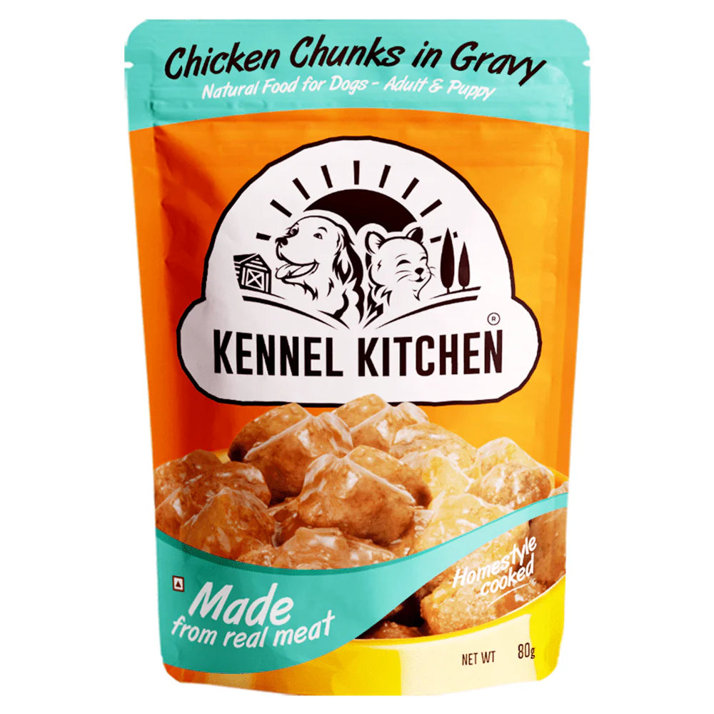 Kennel Kitchen Chicken Chunks in Gravy is made with 100% natural chicken meat. Tasty, gravy covered chicken chunks made with the perfect balance of protein to fat ratio to maintain lean and strong bodies.