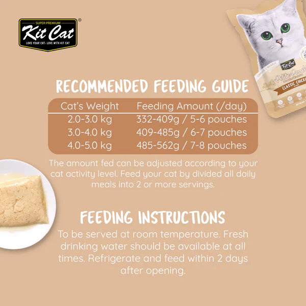 2.0 - 3.0kg: 320-409g/ 5-6 pouches /day 3.0- 4.0kg: 409-485g/ 6-7 pouches /day 4.0 - 5.0kg: 485-562g/ 7-8 pouches /day The amount fed can be adjusted according to your cat activity level. Feed your cat by dividing all daily meals into 2 or more servings. Kit Cat Petite Wet Food is formulated to meet all the nutritional levels established by AAFCO Cat Food Nutrient Profiles. This certifies that Kit Cat Petite Pouch is a nutritionally complete product that can be fed to your cat as its sole ration without adding any other substance except water.