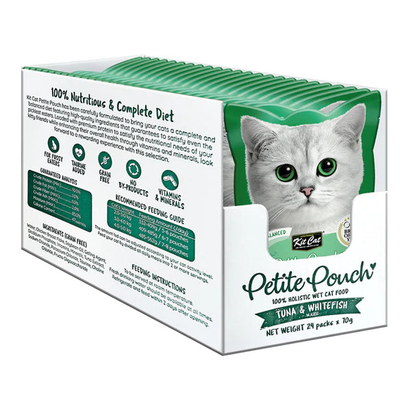 Kit Cat Petite Pouch has been carefully formulated to bring your cats a complete and balanced diet featuring quality ingredients that guarantees to satisfy even the pickiest eaters. Loaded with premium protein to satisfy the nutritional needs of your kitty friends while enhancing their overall health through vitamins and minerals, look forward to a rewarding experience with this selection.