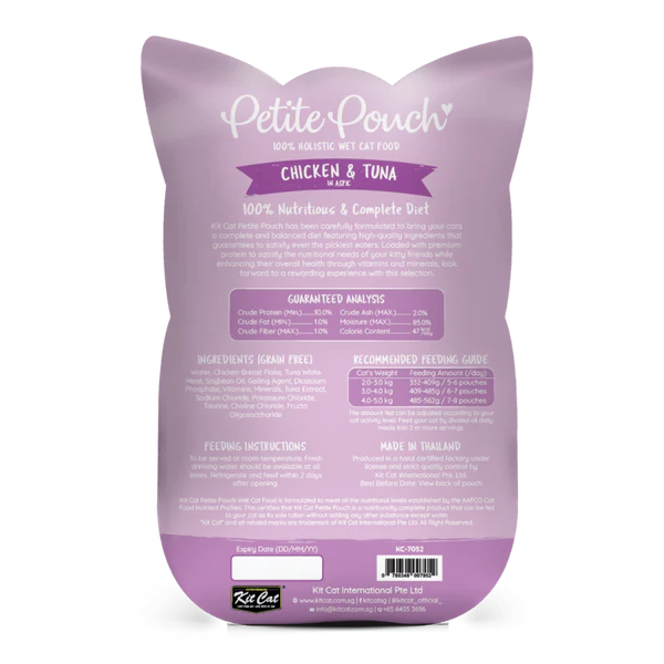 Kit Cat Petite Pouch has been carefully formulated to bring your cats a complete and balanced diet featuring quality ingredients that guarantees to satisfy even the pickiest eaters. Loaded with premium protein to satisfy the nutritional needs of your kitty friends while enhancing their overall health through vitamins and minerals, look forward to a rewarding experience with this selection.