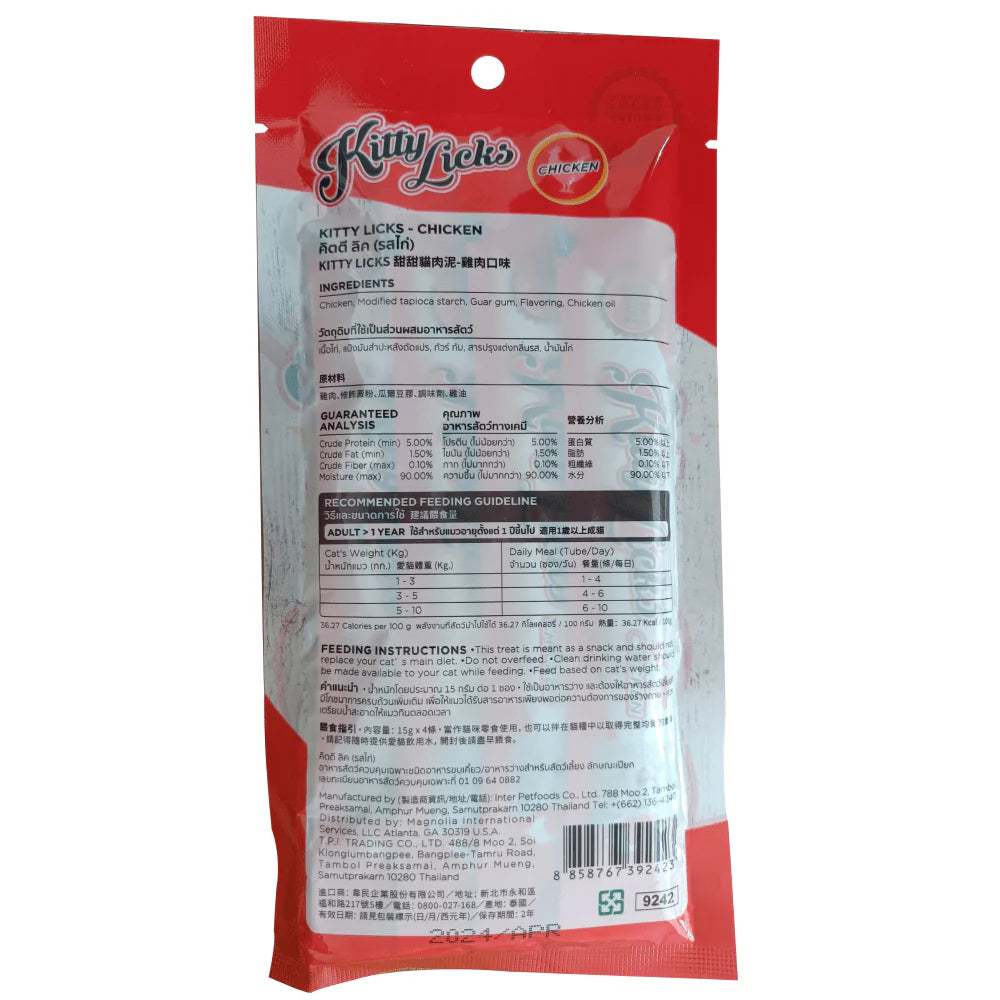 The Kitty Licks is a rich creamy lickable treat for Cats. It comes up with different flavors of chicken as well as Tuna. Feeding Note: This Treat is meant as a snack and should not replace your cat's main diet. Do Not overfeed, Clean Drinking water should be made available to your cat while deeding feed based on the cat's weight.