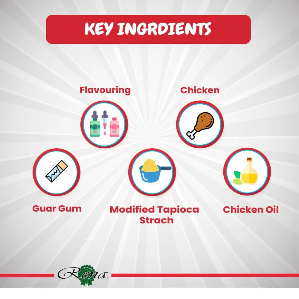 Chicken, Modified Tapioca Starch, Guar gum, Flavoring, Chicken oil