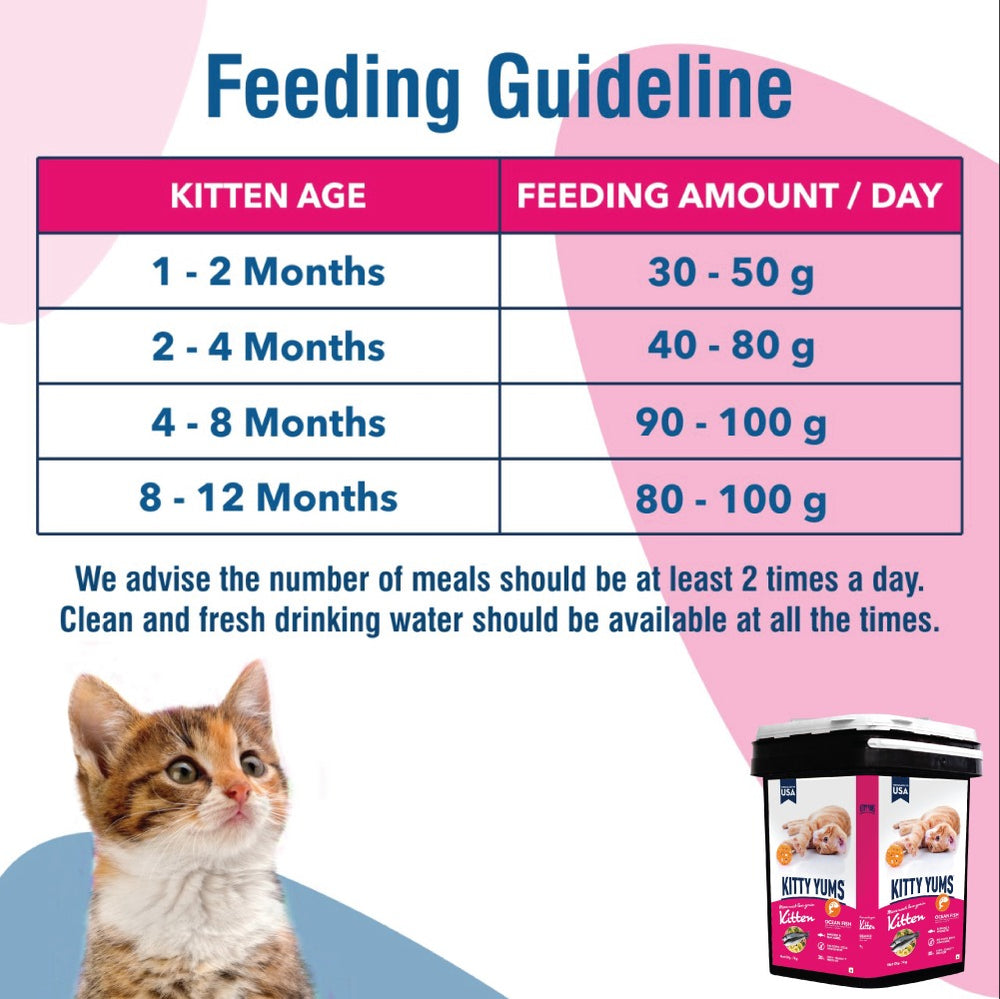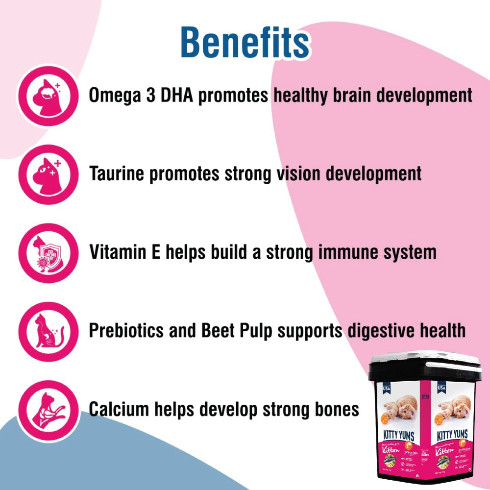 Taurine Promotes Strong Vision Development Omega 3 DHA Helps Promote Healthy Brain Development Vitamin E Helps Build A Strong Immune System Prebiotics And Beet Pulp Support Your Kitten's Digestive Health Essential Minerals Including Calcium Help Develop Strong Bones. Kitty Yums Is Formulated In USA.