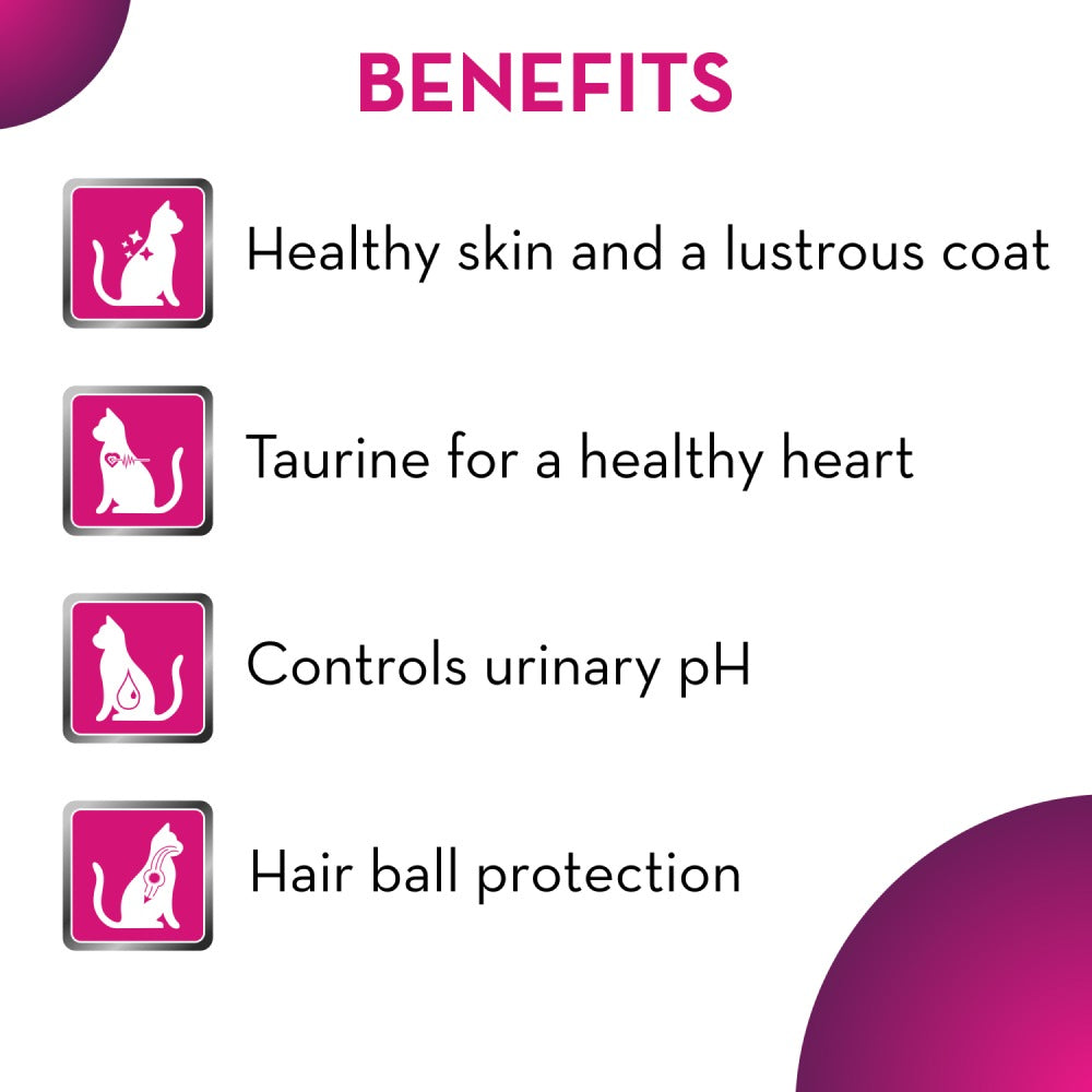 Prebiotics and probiotics protect from hairball formation and improve the digestive system; The blend of organic minerals along with the essential ingredients helps to control urinary pH.