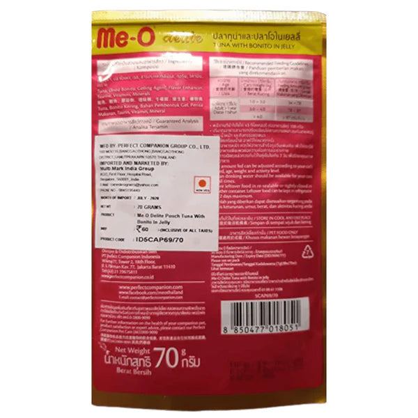 Me-O Delite - Tuna with Bonito in Jelly is a scrumptious meal for adult cats that contains Biotin and Zinc that helps in providing healthy skin and fur. It contains Taurine which improves eyesight. Me-O Delite - Tuna with Bonito in Jelly contains Vitamin C which supports a healthy immune system.