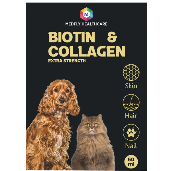 Medfly Healthcare Biotin & Collagen Supplement Drops are designed to promote healthy skin, enhance coat quality, and support hair growth and strength in both dogs and cats. Formulated with essential nutrients, these drops help maintain a vibrant, shiny coat and improve overall skin health. Trust Medfly Biotin & Collagen to provide the vital support your pet needs for a strong, healthy, and beautiful coat.