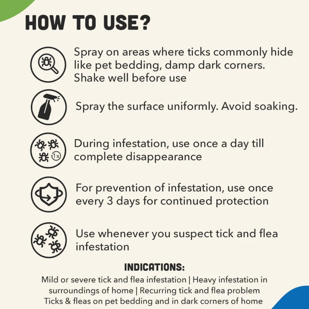 All-natural and safe solution to fight mild or severe tick and flea infestation. It kills or eliminates eggs, nymphs, larvae, and adults of ticks and fleas at home. It shows results within 48 hours of use and is meant for dogs, cats, and pups of all breeds.