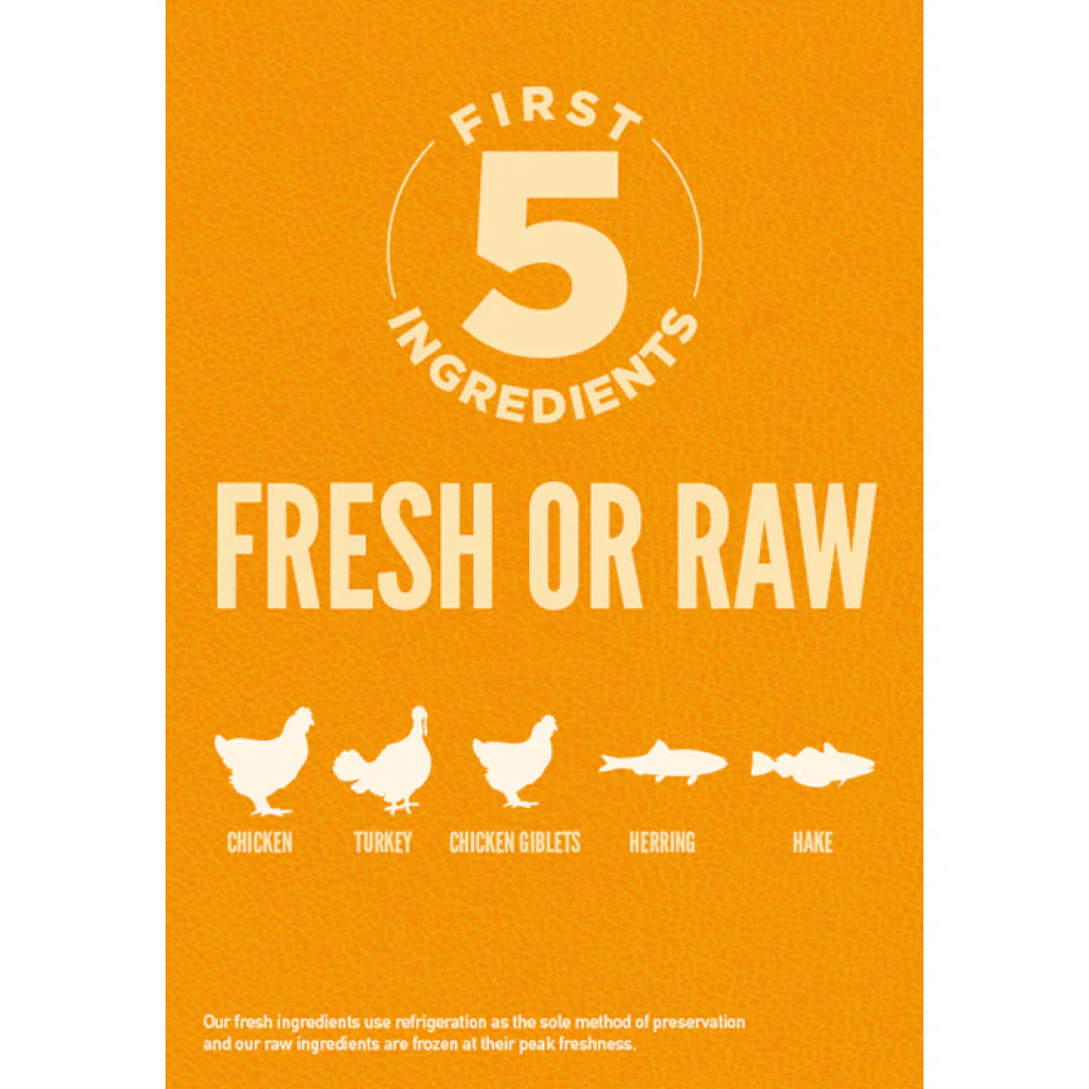 Deboned chicken, deboned turkey, flounder, whole eggs, whole Atlantic mackerel, chicken liver, turkey liver, chicken heart, turkey heart, whole Atlantic herring, dehydrated chicken, dehydrated turkey, dehydrated mackerel, dehydrated chicken liver, whole dehydrated egg, whole red lentils, whole pinto beans, whole green peas, chicken necks, chicken kidney, chicken fat, lentil fiber, Alaskan pollock oil, whole green lentils, whole navy beans, natural chicken flavor, whole chickpeas, ground chicken bone, chicken cartilage, whole pumpkin, whole butternut squash, mixed tocopherols (preservative), sea salt, freeze-dried chicken liver, dried kelp, zinc proteinate, kale, spinach, mustard greens, collard greens, turnip greens, whole carrots, whole apples, whole pears, pumpkin seeds, sunflower seeds, copper proteinate, chicory root, turmeric, sarsaparilla root, althea root, rosehips, juniper berries, dried lactobacillus acidophilus fermentation product, dried bifidobacterium animalis fermentation product, dried lactobacillus casei fermentation product.