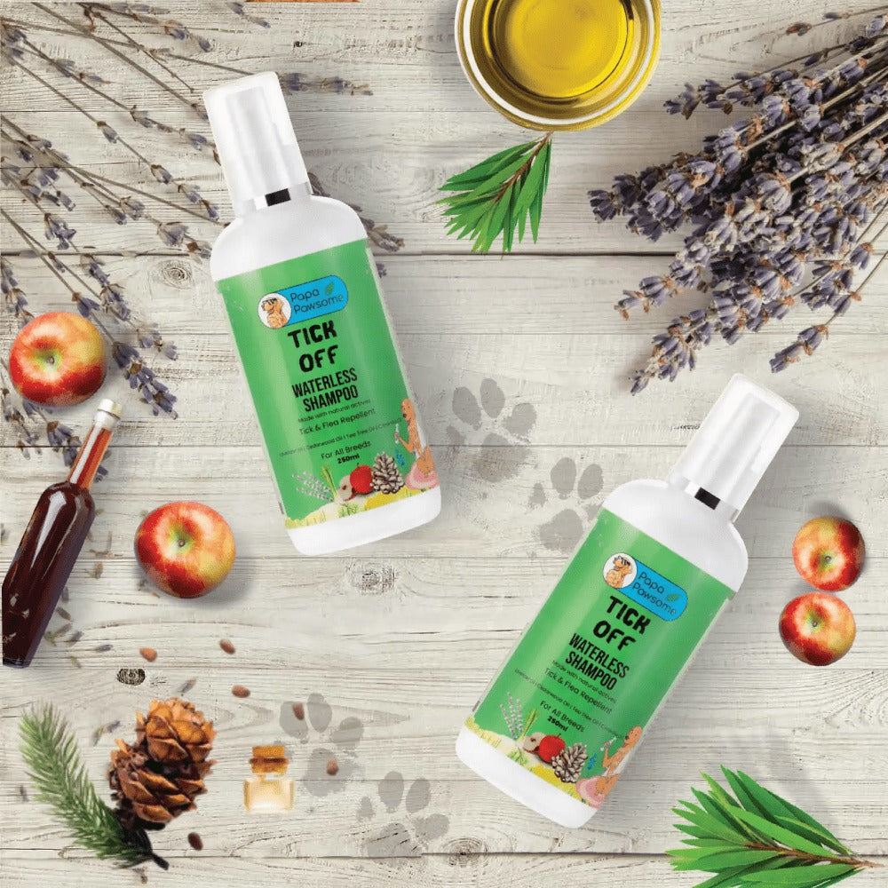 Papa Pawsome's Tick Off Waterless Shampoo is an Anti-Tick Shampoo Dry Shampoo for dogs that's super-easy to use! Especially formulated to repel ticks, fleas, and lice while cleaning their coat and skin without water, it's completely safe, mild yet effective. Made with a blend of 100% natural ingredients and the calming properties of essential oils, it relaxes your dog while cleansing their coat thoroughly, without any side-effects.
