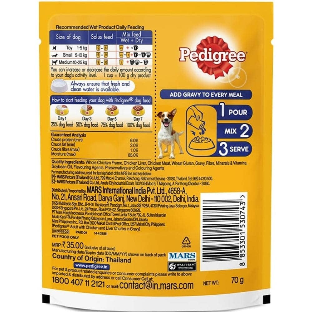 Liver Chunks In Gravy - Pedigree Chicken & Liver wet food for adult dogs contains liver and chicken chunks that enhances the taste of the food and makes it palatable.