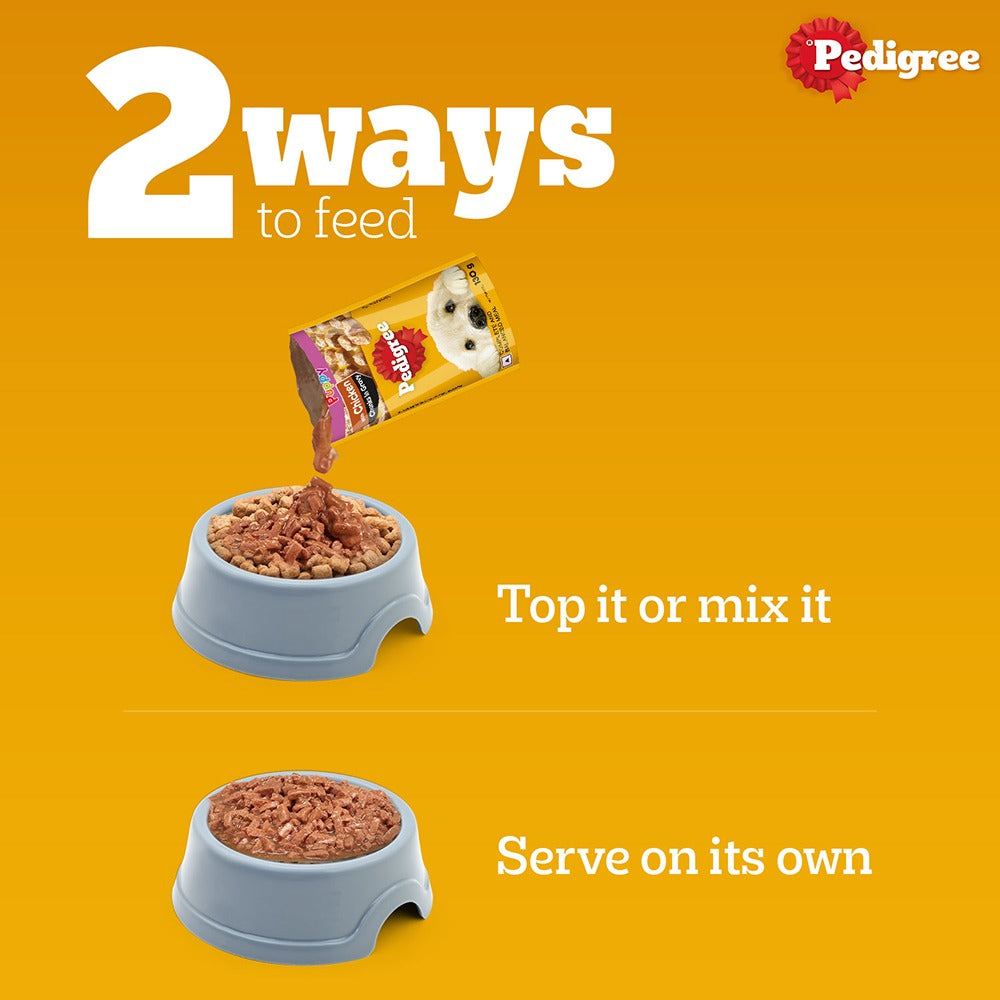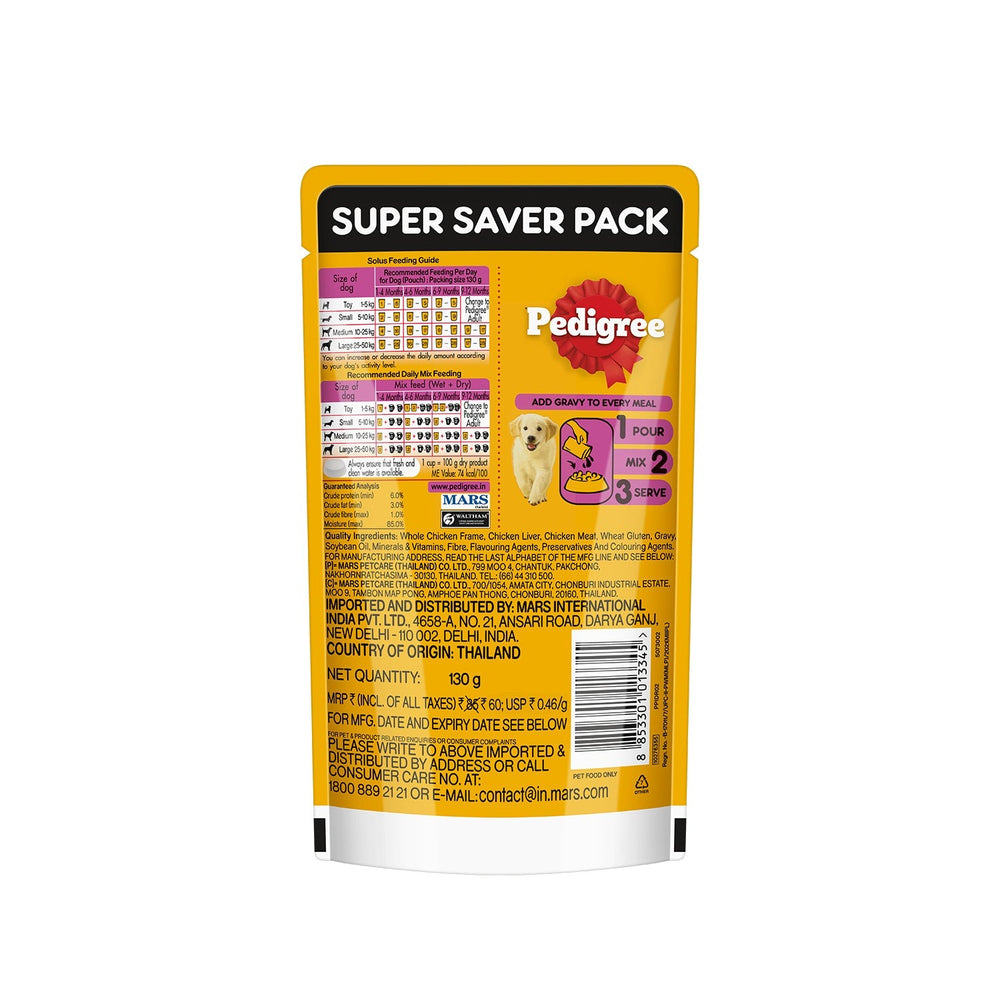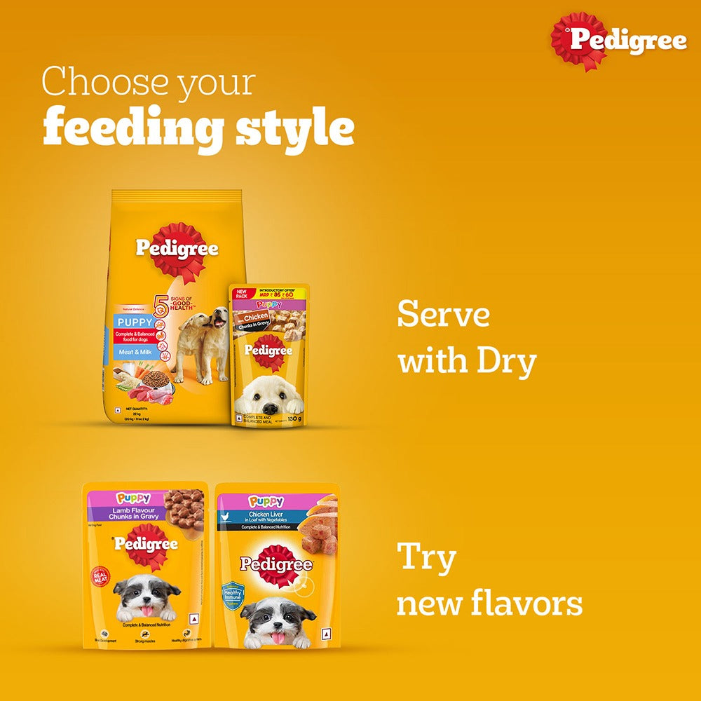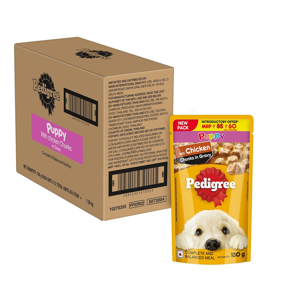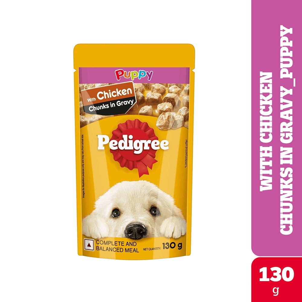 Pedigree provides complete and balanced dog food for puppies to ensure their healthy development. Pedigree Puppy Wet Dog Food, Chicken Chunks in Gravy is a wholesome meal that promotes the healthy growth of your dog. The blend of quality ingredients, including chicken chunks, makes this food a tasty and healthy diet for your furry friend. The tempting aroma and flavor attract even fussy eaters. This wet dog food is rich in moisture to keep your puppy hydrated, even in hot seasons. It contains healthy amounts of essential nutrients such as vitamins, minerals, dietary fiber, and protein. These nutrients ensure healthy functioning of the body system promoting good health in your dogs. Refer to the back of the pack for feeding guidelines. At Pedigree, recipes are developed based on research from the Waltham Centre for Pet Nutrition. Every product from Pedigree meets the requirements laid down by NRC 2006 of the U.S. National Academy of Science. Give your furry companion healthy and lip-smacking mealtimes with Pedigree.