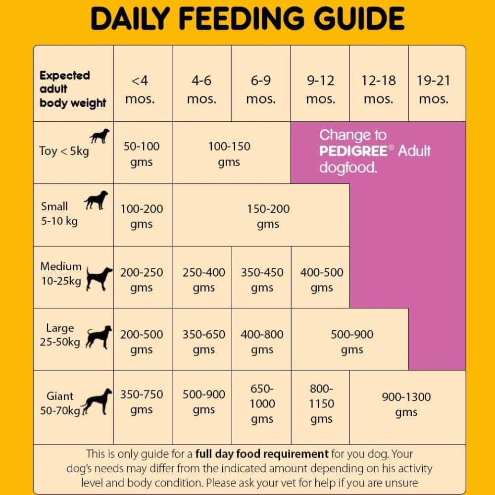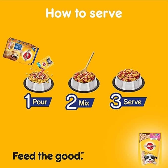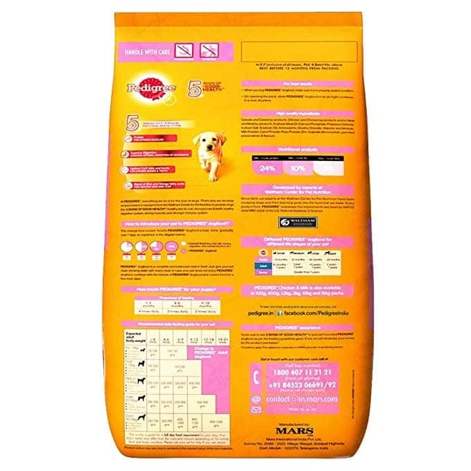 PEDIGREE complete and balanced dog food for puppies is a wholesome meal packed with essential nutrients vital to the healthy growth of your pet. PEDIGREE, with the goodness of cereals, chicken, meat, and the nutrients blend into a tasty and healthy treat for your little one.