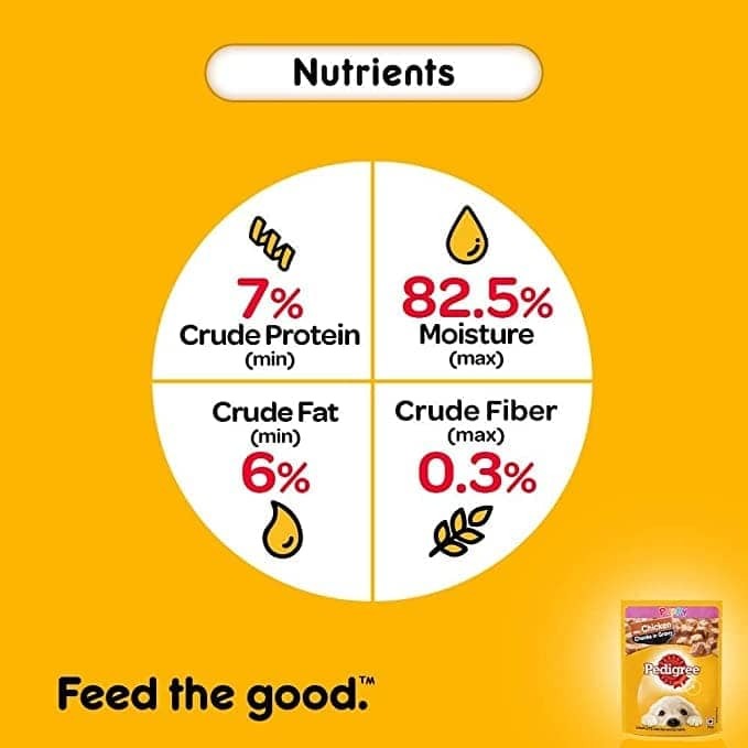 Pedigree Puppy Wet Dog Food, Chicken Chunks is a nutritious and balanced food for your puppy. Made with high quality ingredients, Pedigree dog food provides them 5 signs of good health - healthy skin and coat, strong bones and teeth, healthy digestive system, strong muscles and stronger immune system. Containing a higher moisture content, Pedigree gravy food pouches are especially required for the hot season as they help keep your little pooch hydrated and therefore, energetic, ideal to give as festive food for dogs. This treat can be mixed with any meal - Pedigree dry food or home cooked food - to enhance taste and improve moisture-content. The tempting aroma and flavour of wet for dog is also effective in attracting fussy eaters into eating their meal.