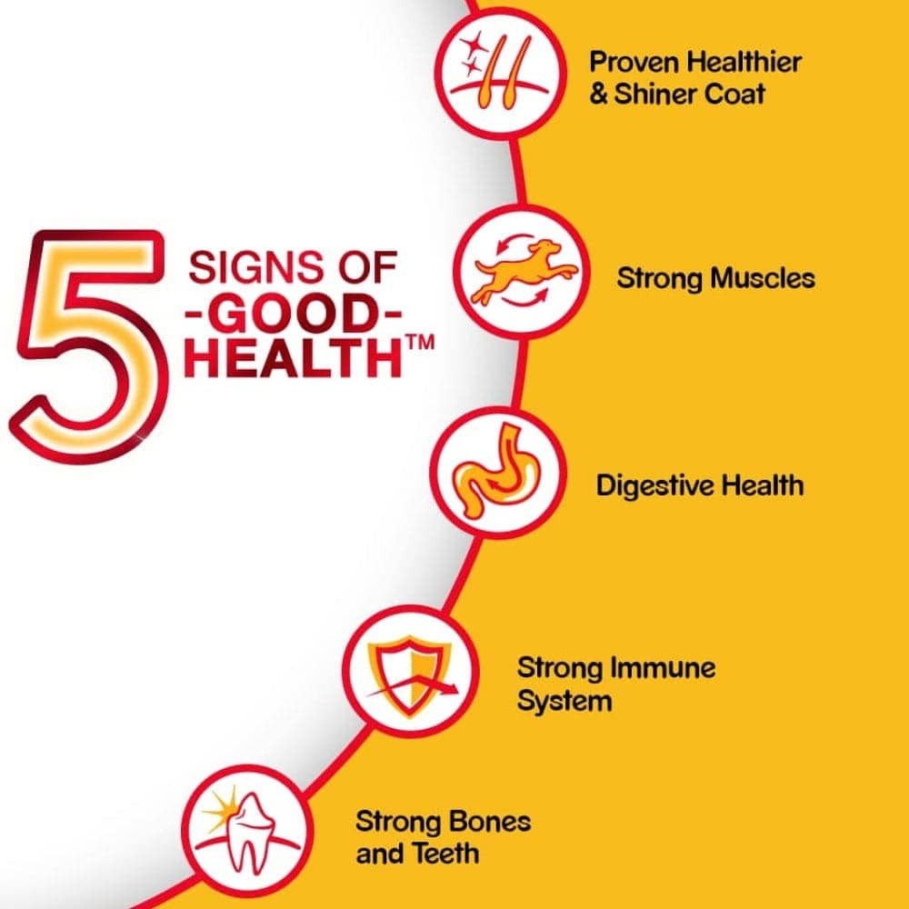 With PEDIGREE, you are sure to see the 5 Signs of Good Health in your pet if you feed him as per the given feeding guidelines. These signs include improved natural defence (from Vitamins (Vit E) and Minerals); Strong Muscles (from Protein); Optimal Digestion of Nutrients; Strong Bones and Teeth (from Ca:P ratio & levels); Healthy Skin and Coat (from blend of Zinc and Omega Fatty Acids).