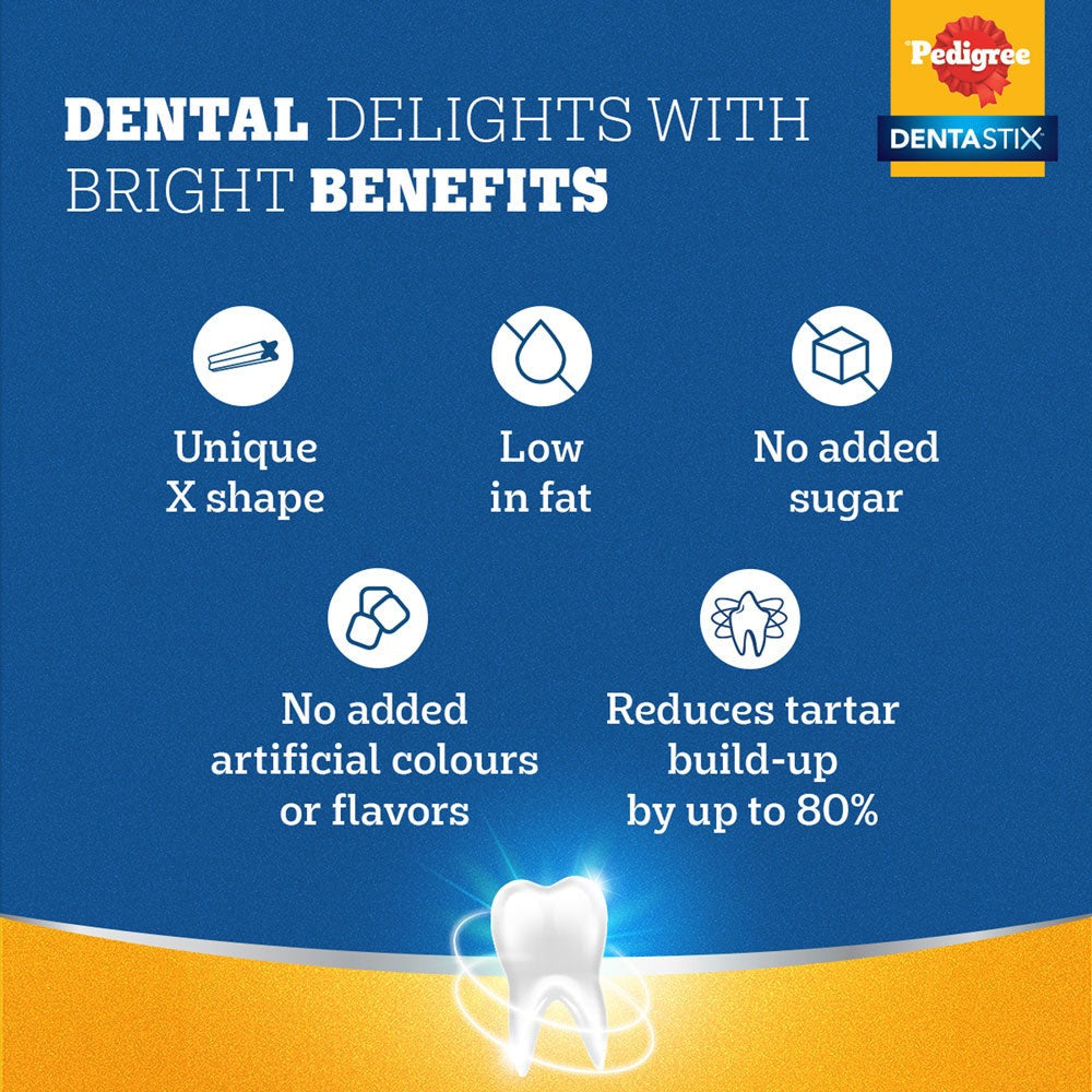 Pedigree offers healthy and tasty dog treats that keep your dog wagging its tail. According to Kortegaard et al., JSAP 2008, 4 out of 5 dogs over the age of three suffer from gum disease. Pedigree Dentastix Oral Care Dog Treat is an effective daily dental care dog treat recommended by vets. It is scientifically proven to help reduce tartar build-up in your dog’s teeth by up to 80%. When fed daily as part of an oral care routine, this treat keeps your dog's teeth and gums strong and healthy by cleaning between teeth and down to the gum line. Its unique x-shape and abrasive texture help in cleaning hard-to-reach teeth. Active ingredients such as Zinc Sulphate and Sodium Tripolyphosphate provide healthy oral care for your furry friend. Just one stick of Dentastix a day is enough to keep your dog's mouth clean. This oral care treat is completely digestible and has no residue, so it can be served as a tasty dog treat with actual dental benefits. It is recommended for all adult large -breed (25+ kg) dogs over 4 months of age. Pedigree treats are formulated based on research done by the Waltham Centre for Pet Nutrition. Keep your dog's mouth healthy and tail wagging by giving them Pedigree Dentastix.