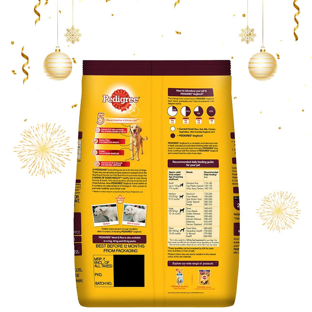 Pedigree offers dogs complete and balanced dog food for a healthy and active life. Pedigree Adult Dry Dog Food in Meat and Rice Flavor is a wholesome meal packed with essential nutrients vital to the overall health of your pet. The goodness of quality ingredients, including meat and rice, blends into a tasty and healthy diet for your furry friend. When fed as per the feeding guidelines (refer to the back of the pack), you will see the 5 Signs of Good Health in your pet. These signs include healthy skin and coat (from a blend of Zinc and Omega Fatty Acids); strong bones and teeth (from Ca:P ratio and levels); healthy digestion (from dietary fiber); strong muscles (from Protein); improved natural defense (from Vitamins (Vitamin E) and Minerals). At Pedigree, recipes are developed based on research from the Waltham Centre for Pet Nutrition. Every product from Pedigree meets the requirements laid down by NRC 2006 of the U.S. National Academy of Science. Give your furry companion healthy and lip-smacking mealtimes with Pedigree.