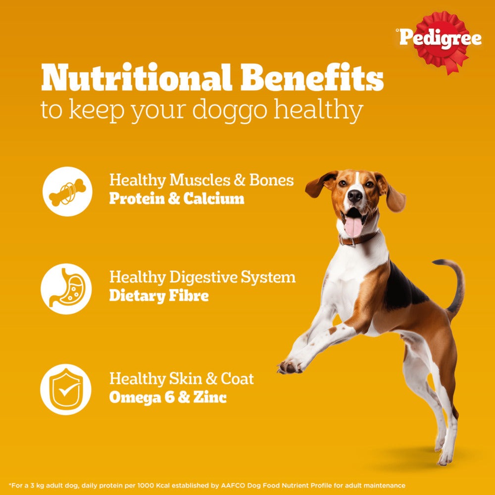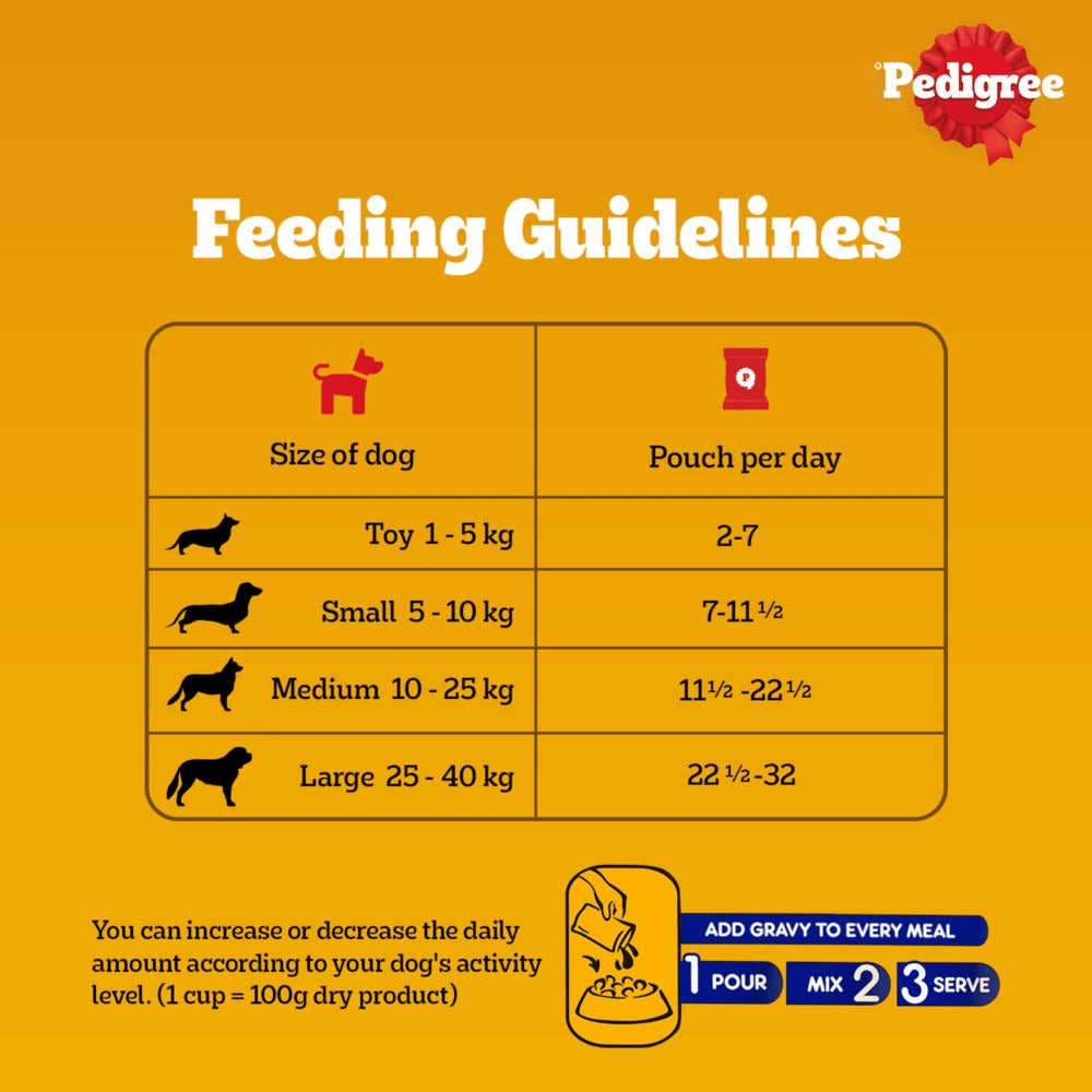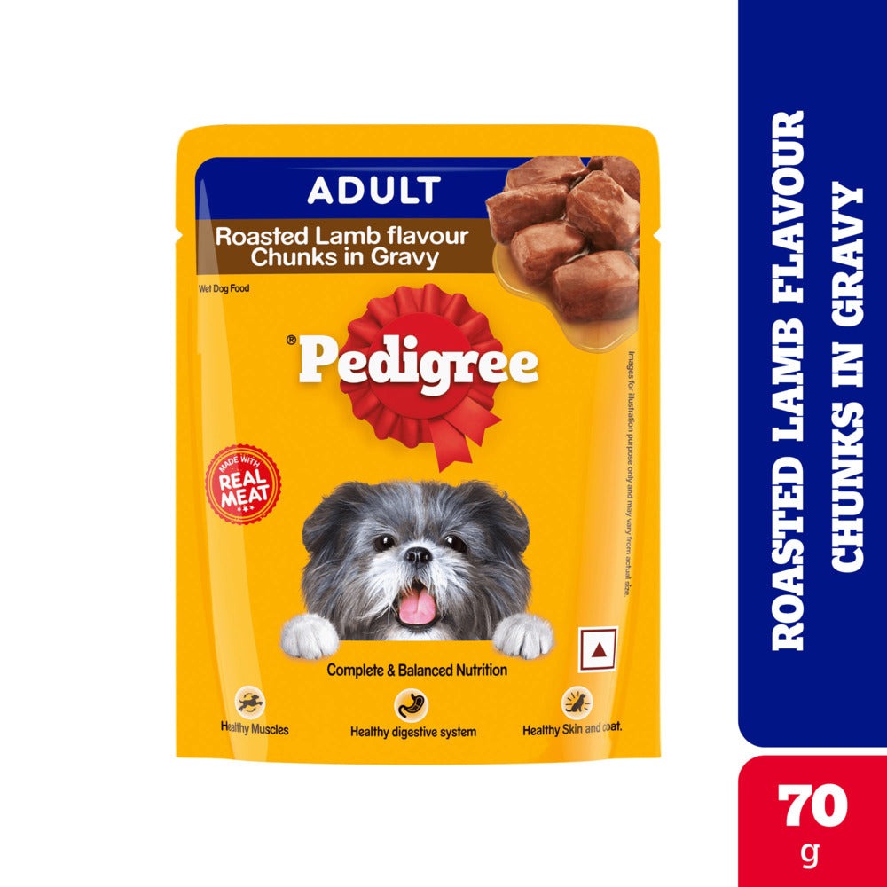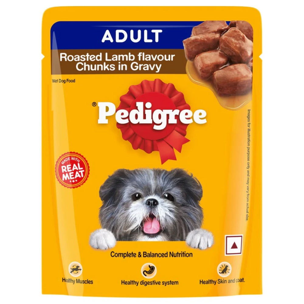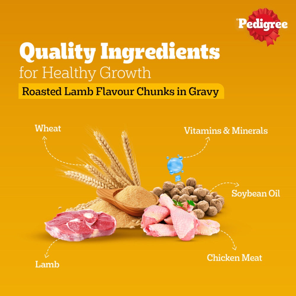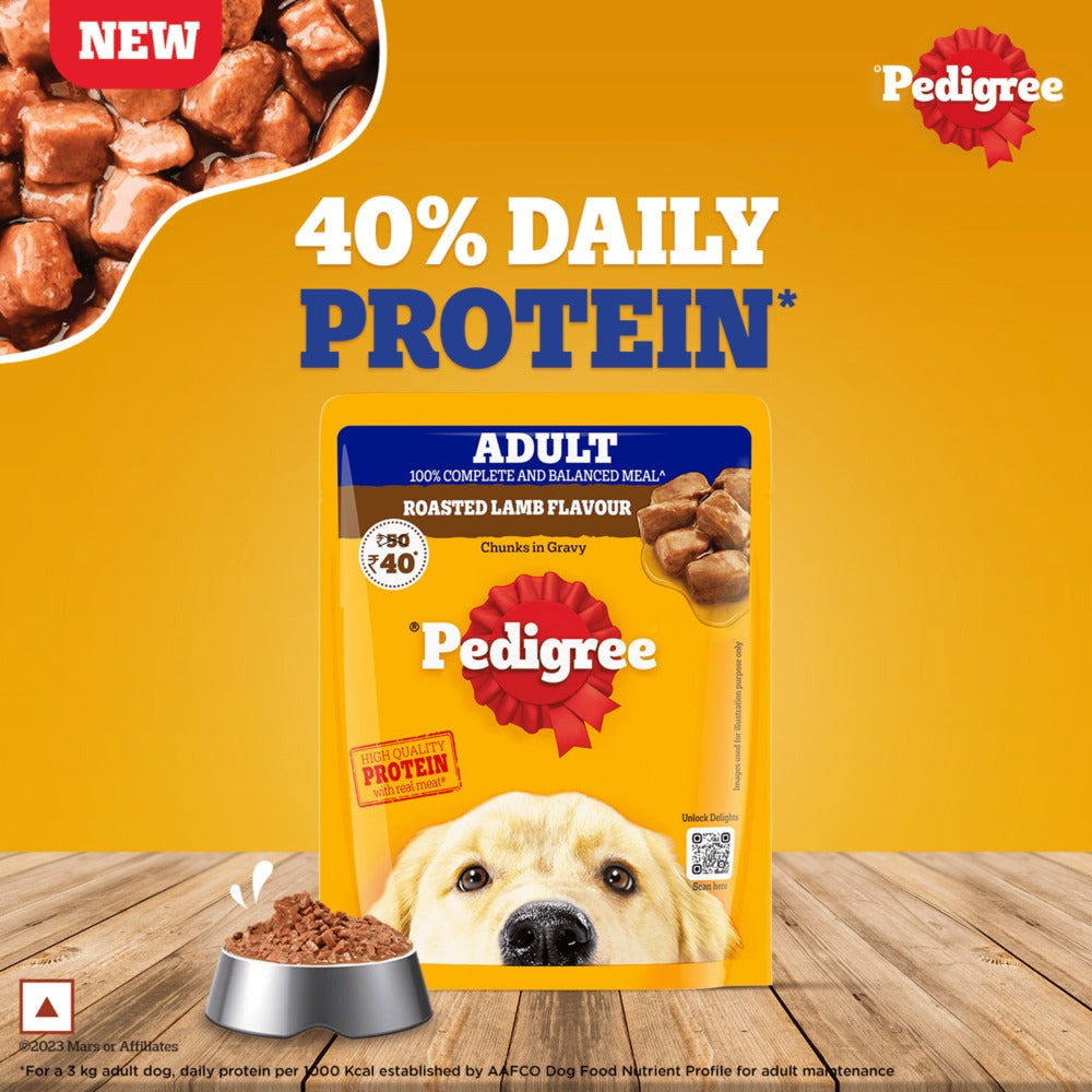 Make every mealtime a fusion of taste and nutrition for your Dog with Pedigree. Made with real meat and high quality protein, Pedigree Adult Wet Dog Food, Roasted Lamb Flavour Chunks in Gravy, ensures that you are providing a meal that keeps your dog happy and supports their well-being. This exciting meal is packed with gravylicious roasted lamb flavour chunks that your furry companion will love. Packed with essential nutrients, it is a 100% complete and balanced meal that provides your dog with all the nutrients to stay healthy and strong. Protein & Calcium support healthy muscles & bones while Dietary Fibre supports a healthy digestive system. Omega 6 and Zinc help keep your dog’s skin and coat healthy. The water content in the meal ensures your dog is well-hydrated. At Pedigree, recipes are developed based on research from the Waltham Centre for Pet Nutrition. Every product from Pedigree meets the requirements laid down by NRC 2006 of the U.S. National Academy of Science. Give your dog the goodness of Pedigree to satisfy their cravings and support their good health.