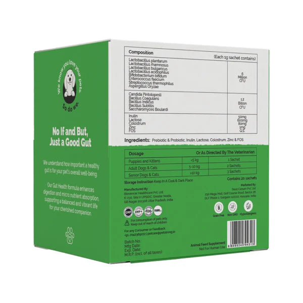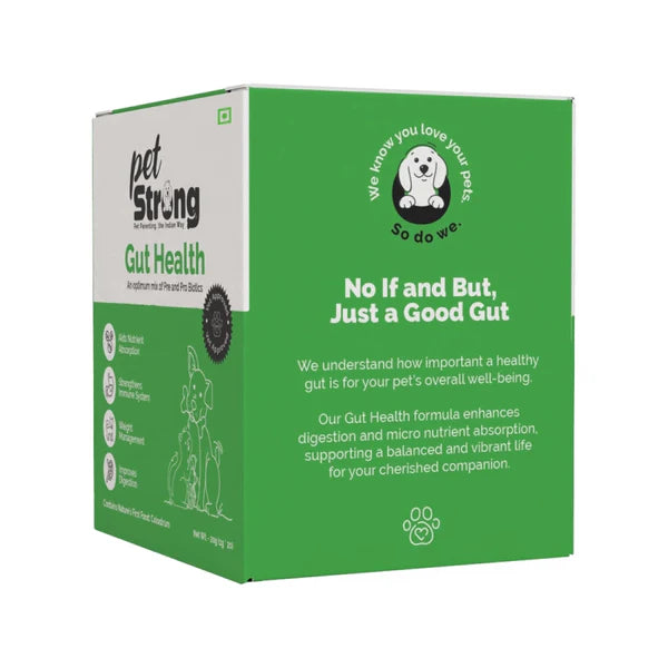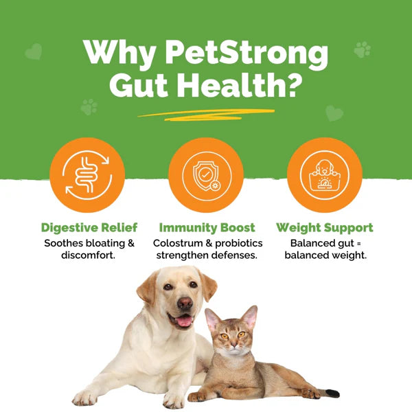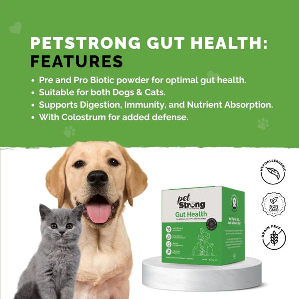 PetStrong Gut Health is a scientifically formulated prebiotic and probiotic supplement designed to improve digestion, boost immunity, and promote overall gut health for dogs and cats. Each 1g sachet provides 1.2 billion CFU of beneficial bacteria, including Lactobacillus, Bifidobacterium, and Bacillus strains. PetStrong Gut Health is also enriched with colostrum, nature’s first food, known for its immune-boosting properties. Studies show that 70% of your pet’s immune system is housed in their gut, making it essential to maintain a healthy balance of gut flora. PetStrong Gut Health is grain-free, non-GMO, and hypoallergenic, making it ideal for pets with sensitive stomachs. With regular use, it helps support nutrient absorption, healthy weight management, and improved digestion, ensuring your pets thrive. Manufactured in a GMP, GMP+, FAMI-QS Certified and FDA Approved facility, PetStrong Gut Health is in compliance with the highest standards for safety and quality.