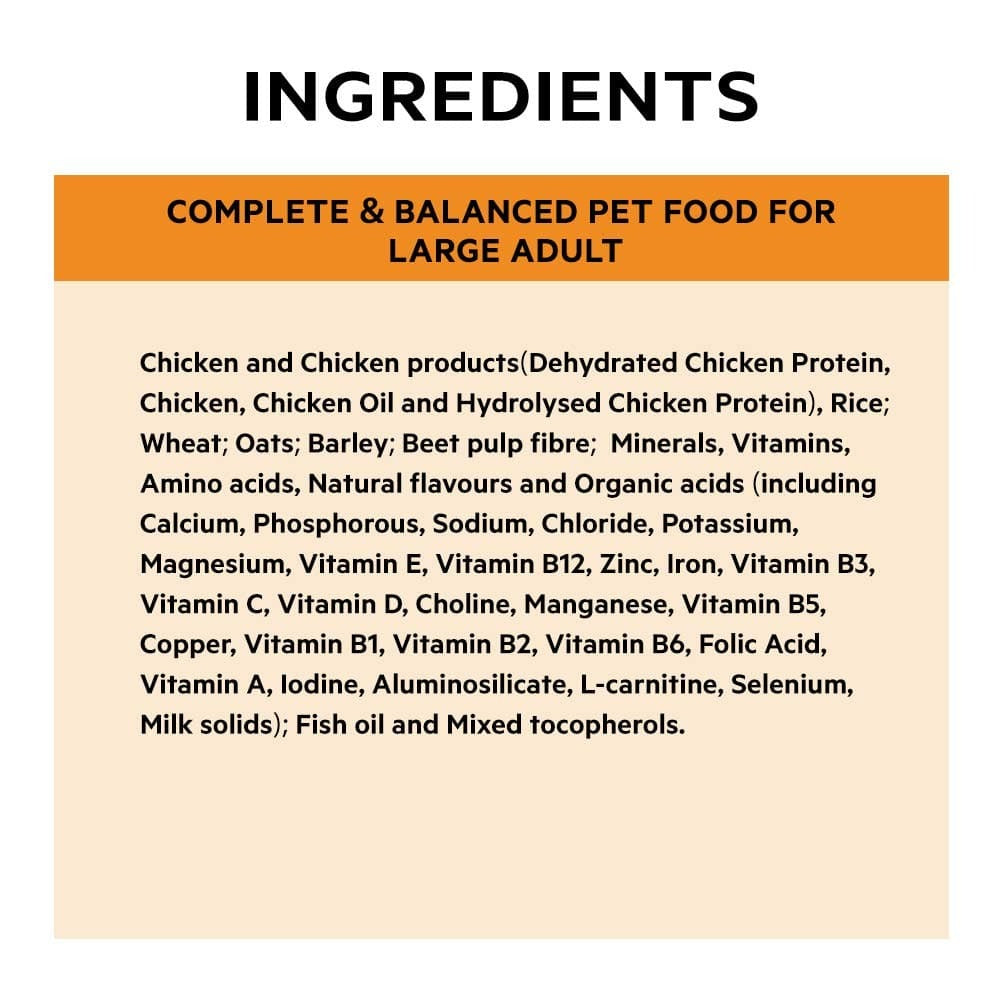 Chicken (dehydrated chicken-natural glucosamine source, chicken); brewers rice; whole grain wheat; oats; barley; animal fat preserved with mixed-tocopherols (form of vitamin E); animal digest; beet pulp; minerals, vitamins, amino acids, organic acids and natural flavours (including calcium, phosphorous, sodium, chloride, potassium, magnesium, vitamin E, vitamin B12, zinc, iron, vitamin B3, vitamin C, vitamin D, choline, manganese, vitamin B5, copper, vitamin B1, vitamin B2, vitamin B6, folic acid, vitamin A, Iodine, aluminosilicate, L-Carnitine, selenium); fish oils and natural antioxidants.