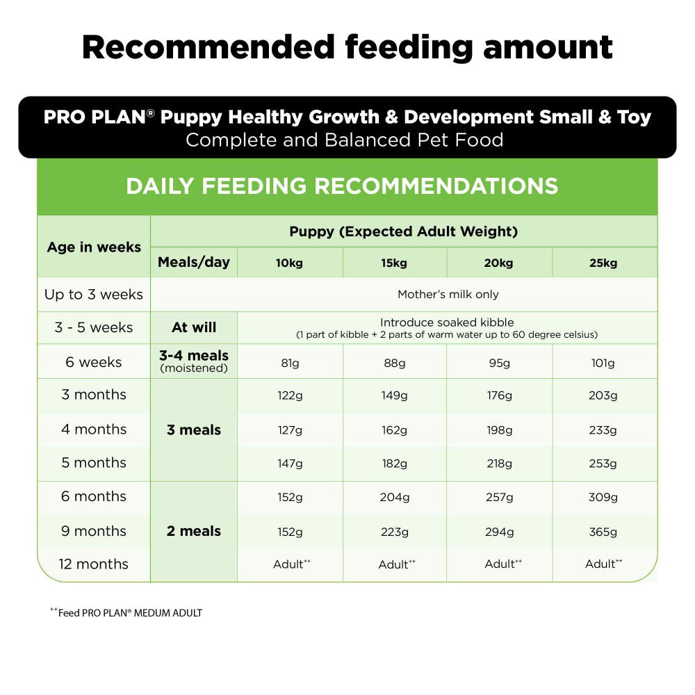 Serving Recommendation: By choosing to feed your dog PRO PLAN you can be reassured that our tailored nutrition will have a positive impact on your dog’s long-term health and well-being. Although you will be keen to see the difference PRO PLAN® can make in your dog, please allow 7 – 10 days to transition from their current food. This enables your dog’s digestive enzymes to gradually adapt to the change in ingredient and nutritional content, assisting with the proper digestion of the food and helping prevent stomach upsets. Each day, simply feed a little less of the previous food and a little more of PRO PLAN until you are feeding PRO PLAN® exclusively.