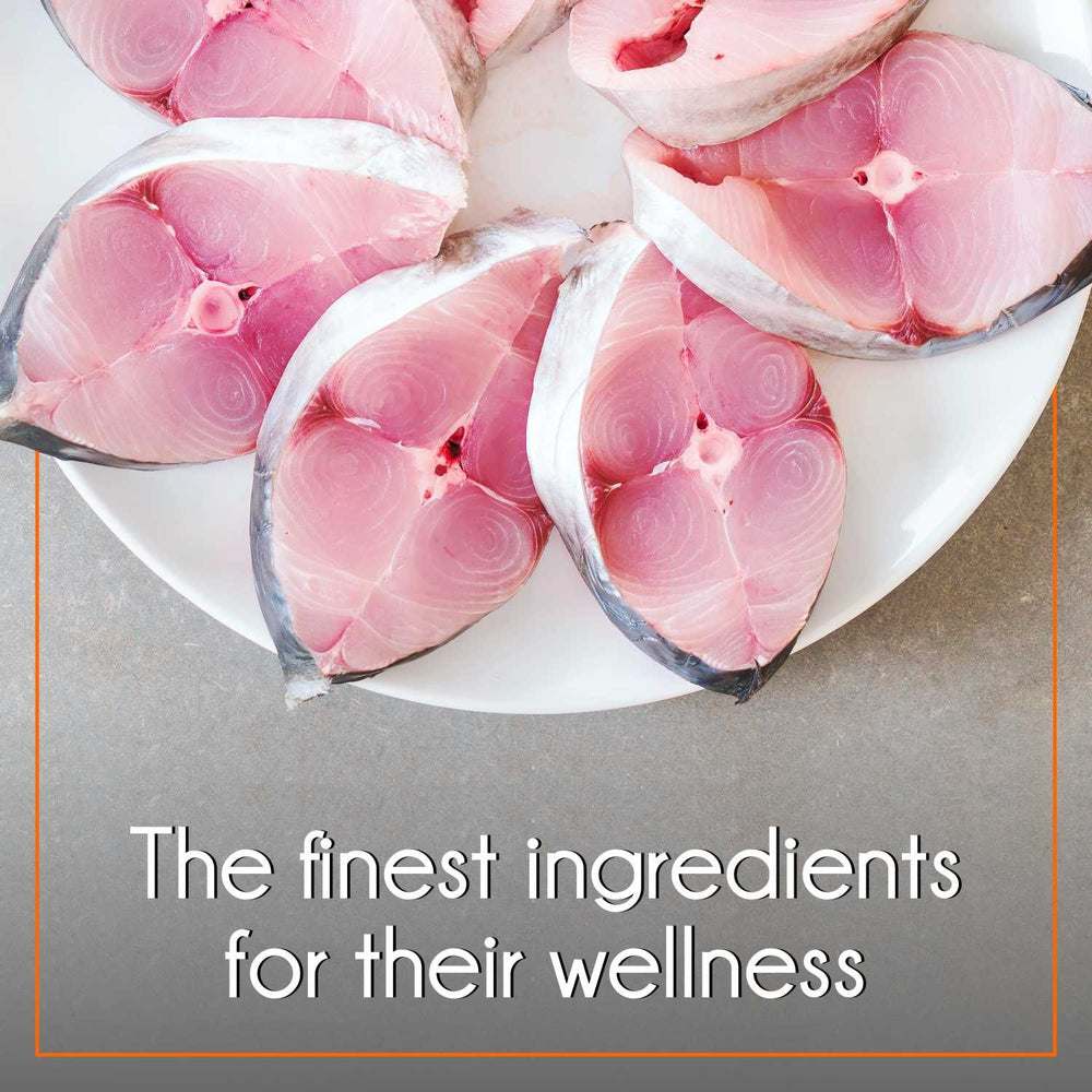 Sardine, Mackerel, Eggs, Corn Gluten Meal, Whole Grain Cereals, Soya Refined Oil, Wheat Flour, Taurine, Vitamins (Vit A, Vit E, Vit B1, Vit B6, Vit B2, Vit B12, Choline, Niacin, Folic Acid), Organic Minerals (Zinc, Iron, Copper, Selenium, Manganese), Prebiotics & Probiotics.