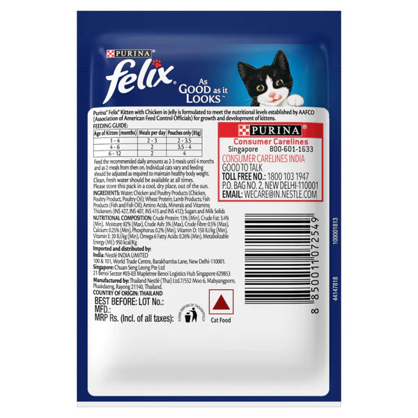 Nestle Purina Felix was introduced in the year 1970 and is already the number one cat food brand in the markets of the UK, Germany, Australia and Thailand. Felix As Good as it Looks is a range of delicious meals specially prepared with tender meaty pieces in a succulent jelly that your cat won't get enough of. They are full of healthy goodness to satisfy 100% of your cat's daily needs when fed according to the feeding guidelines on the pack. Felix is a tasty cat food that cats really want and enjoy. A variety of great tastes, flavours, textures, and visual appeal. Complete and nutritionally balanced meals made from quality ingredients.