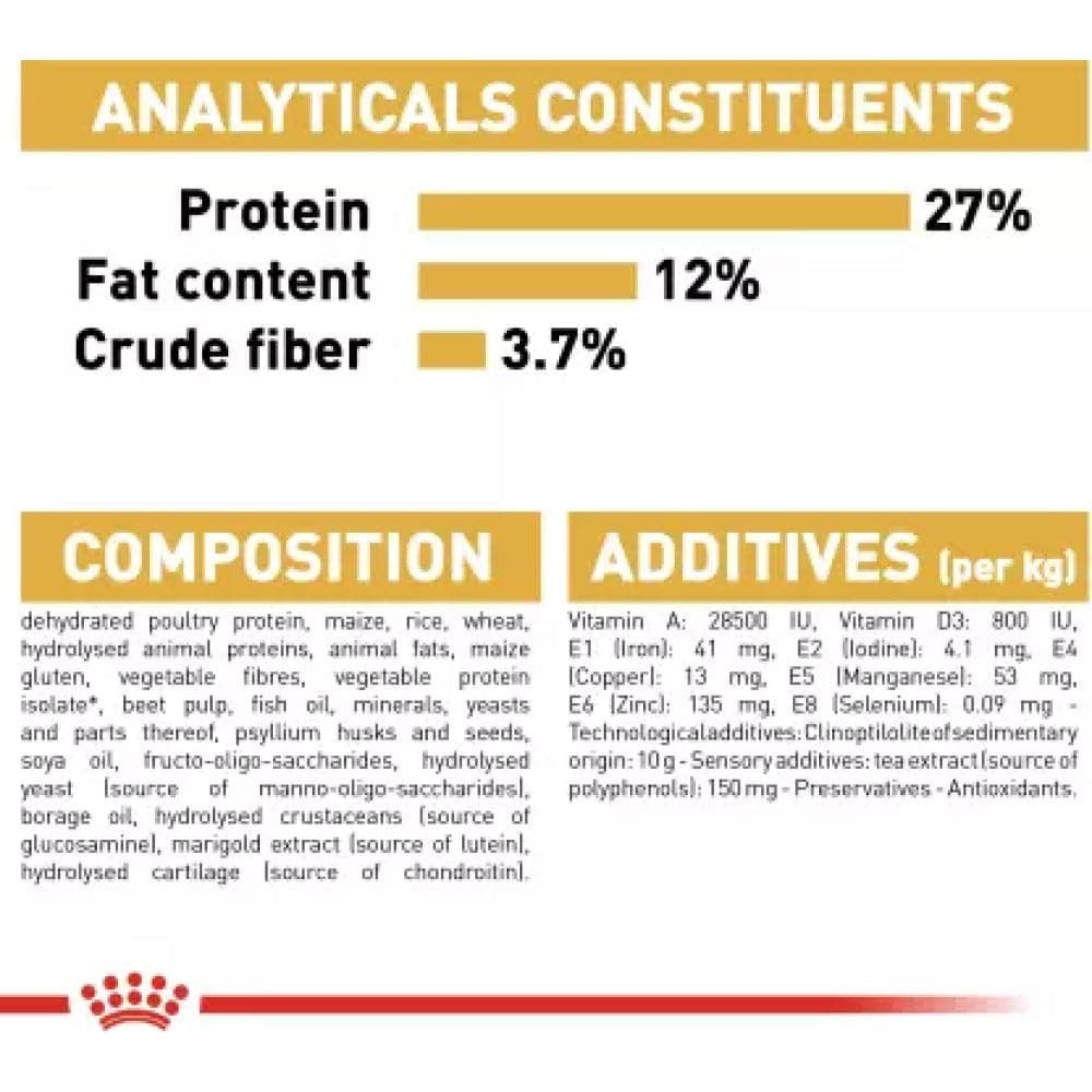 Composition: Dehydrated poultry protein, maize, rice, wheat, hydrolysed animal proteins, animal fats, maize gluten, vegetable fibres, vegetable protein isolate*, beet pulp, fish oil, minerals, yeasts and parts thereof, psyllium husks and seeds, soya oil, fructo-oligo-saccharides, hydrolysed yeast (source of manno-oligo-saccharides), borage oil, hydrolysed crustaceans (source of glucosamine), marigold extract (source of lutein), hydrolysed cartilage (source of chondroitin).Additives (per kg): Nutritional additives: Vitamin A: 28500 IU, Vitamin D3: 800 IU, E1 (Iron): 41 mg, E2 (Iodine): 4.1 mg, E4 (Copper): 13 mg, E5 (Manganese): 53 mg, E6 (Zinc): 135 mg, E8 (Selenium): 0.09 mg - Technological additives: Clinoptilolite of sedimentary origin: 10 g - Sensory additives: tea extract (source of polyphenols): 150 mg - Preservatives - Antioxidants.Analytical Constituents: