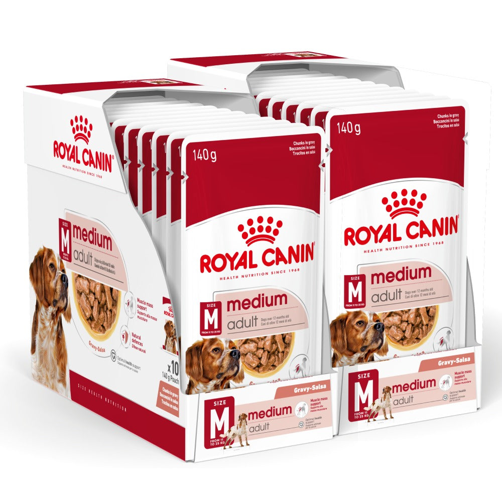 Suitable for dogs aged between 12 months and 10 years old that weigh between 11-25 kg, ROYAL CANIN® Medium Adult in Gravy is specially formulated with all the nutritional needs of your medium sized adult dog in mind. ROYAL CANIN® Medium Adult in Gravy supports optimal digestive health, as well as helping to maintain a healthy balance of intestinal flora.Thanks to a specific antioxidant complex and additional prebiotics, ROYAL CANIN® Medium Adult in Gravy helps to support and maintain your dog's natural defences.What's more, ROYAL CANIN® Medium Adult in Gravy is enriched with EPA and DHA – these Omega-3 fatty acids contribute to the maintenance of healthy skin and coat condition. To cater to each dog's individual preferences, ROYAL CANIN® Medium Adult is also available as dry food, with crunchy and tasty kibble. If you're considering mixed feeding, simply follow our feeding guidelines to ensure your dog gets an accurate amount of both wet and dry food for optimal benefit.