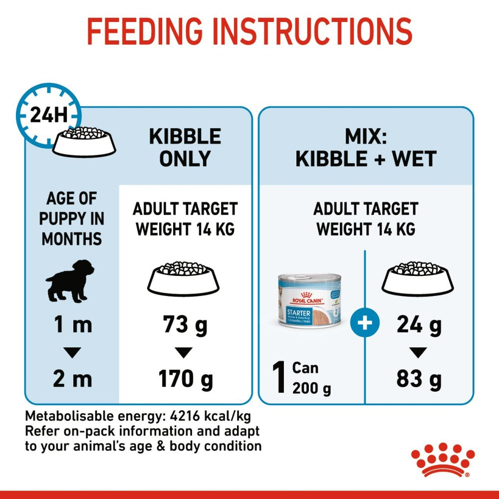 If your medium-sized dog is pregnant or has recently given birth, it's important that she and her puppies get the right level of nutritional support to ensure continued health for the mother, and the best start possible for the puppies. ROYAL CANIN® Medium Starter Mother & Babydog is specially formulated with the nutritional needs of your dog and her puppies in mind. Start Complex' is the fruit of ROYAL CANIN®'s ongoing science, it's an exclusive combination of nutritional elements which are present in the mother's milk, reinforced with specific nutrients that actively contribute to supporting the puppies' digestive health and natural defences. The texture of this food is perfectly suitable for weaning puppies off the mother's milk and onto more solid food. When mixed with water, the kibble in ROYAL CANIN® Medium Starter Mother & Babydog is easy to rehydrate to a porridge-like consistency which is very palatable for your dog, as well as for her puppies. ROYAL CANIN® Medium Starter Mother & Babydog's nutritional profile is adapted to meet your dog's high energy needs from day 42 of gestation and throughout the lactation period.