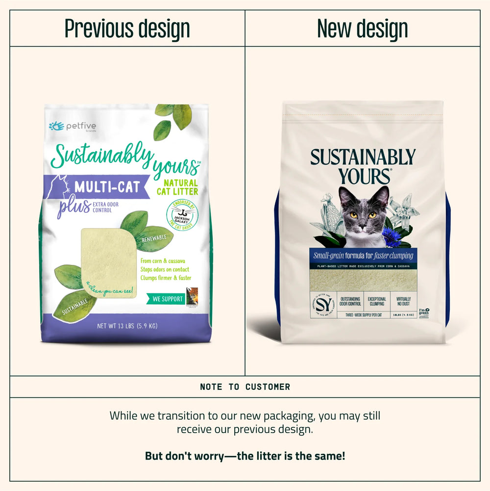 At Sustainably Yours, we set out to create a litter that is both high-performing and environmentally friendly. Our plant-based formula is full of benefits for both you and your cat—all while remaining sustainable. Small-grain formula for faster clumping.