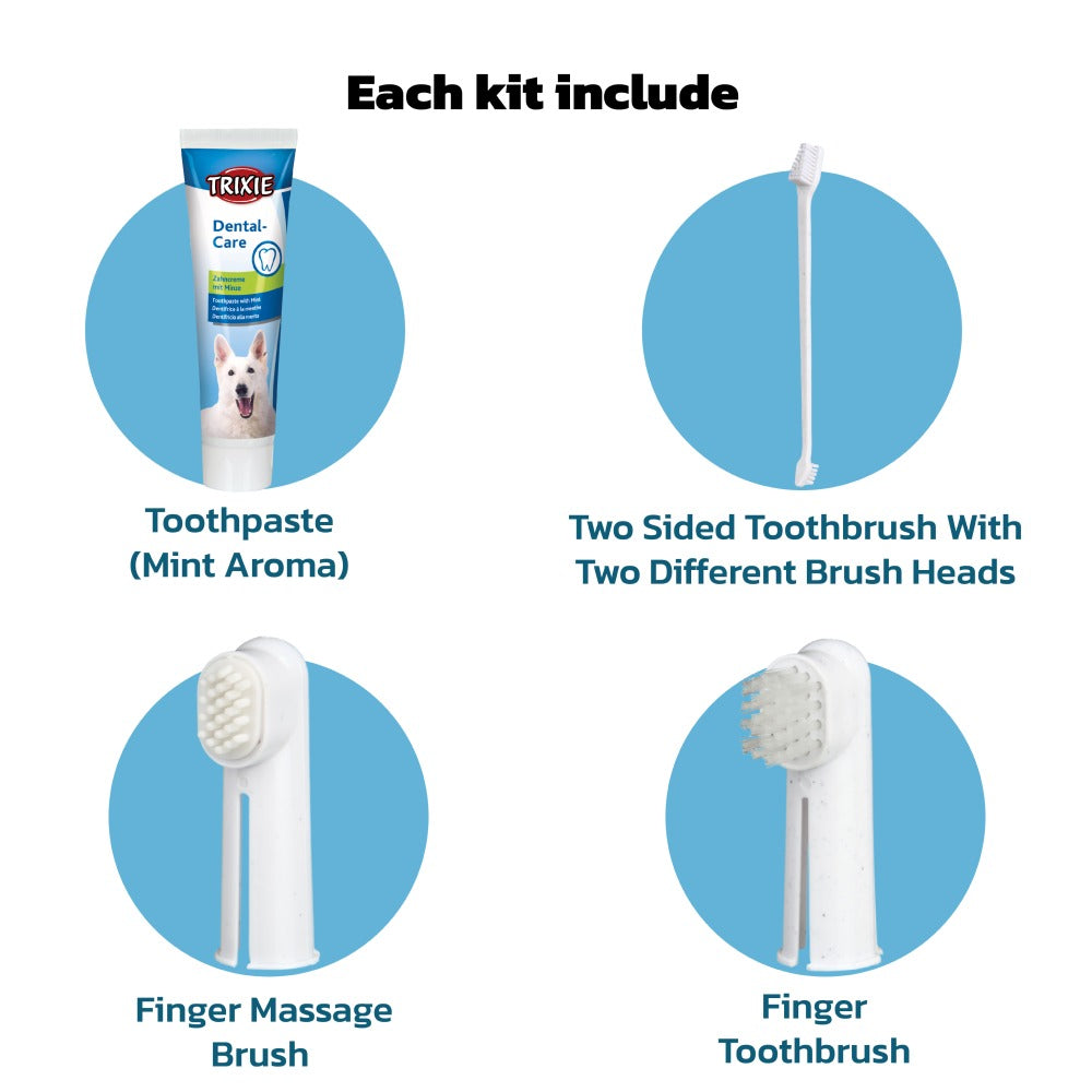 Trixie dog dental care kit provides everything which you need for your dog dental hygiene. Regular brushing of your dog’s teeth with toothpaste will help prevent the build-up of tartar. It improves the dental hygiene and keeps breath clean and fresh. Each kit includes: 1 toothpaste with mint (100gm), 1 finger toothbrush, 1 finger massage brush, 1 twosided toothbrush with two different brush heads.