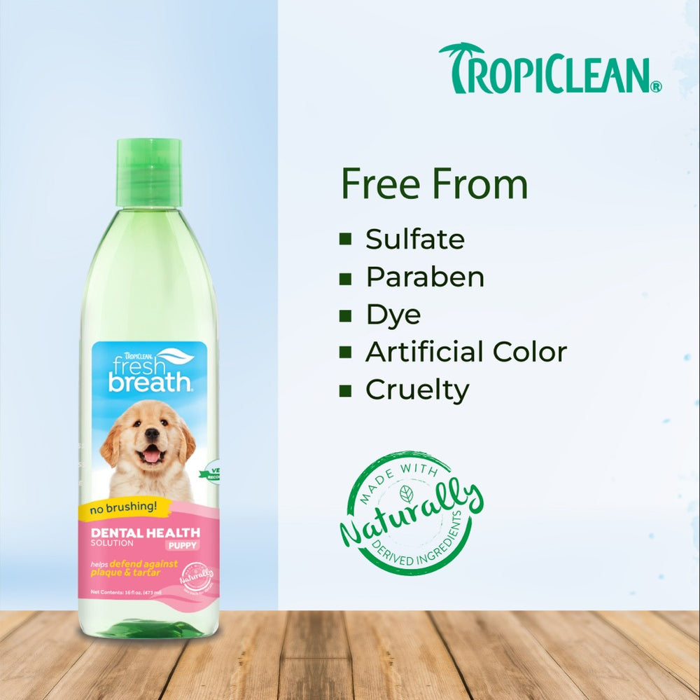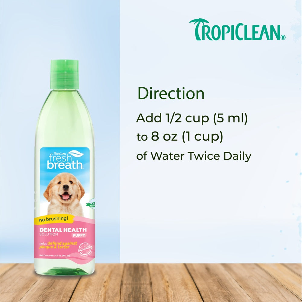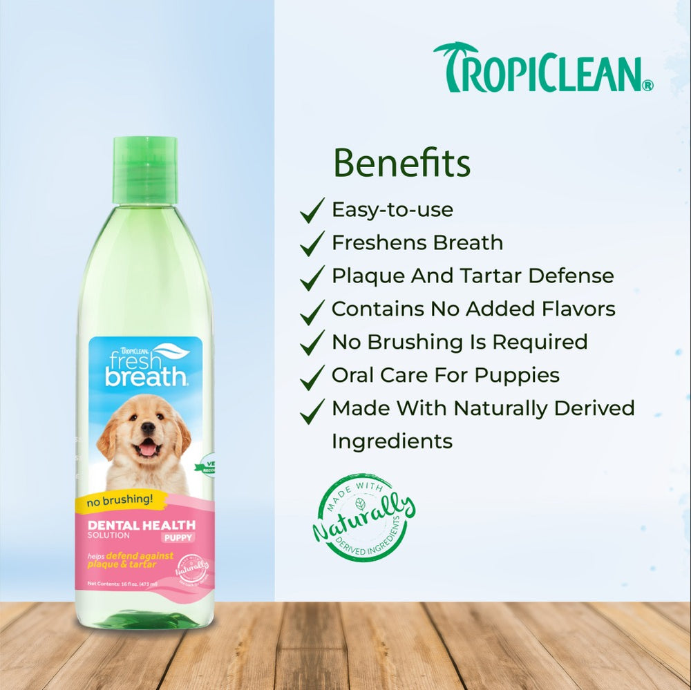 Tropiclean's natural water additive is developed to provide dogs and cats with essential daily oral hygiene care. Without proper dental care, 70 percent of dogs and cats start to show signs of oral disease by age 3. Oral disease can eventually lead to tooth loss or other serious health problems. Tropiclean's natural water additive promotes healthy gums and eliminates bad breath for up to 12 hours.