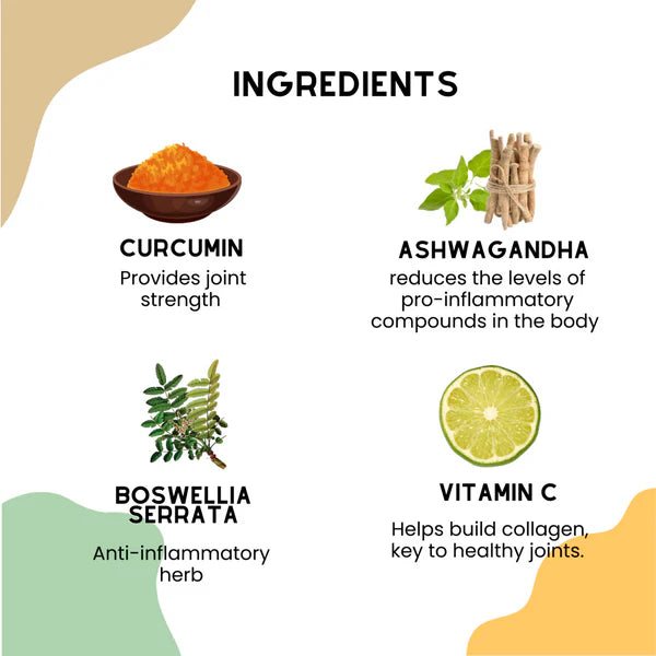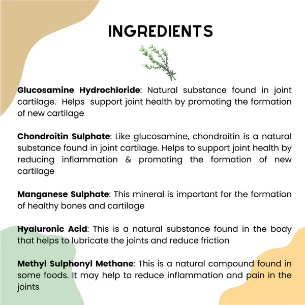Ingredients: Glucosamine Hydrochloride, Chondroitin Sulphate, Manganese Sulphate, Boswellia Serrata, Withania Somnifera (Ashwagandha), Hyaluronic Acid, Vitamin C, Curcumin 95%, Methyl Sulphonyl Methane, Brewers Yeast.