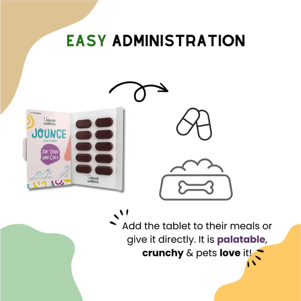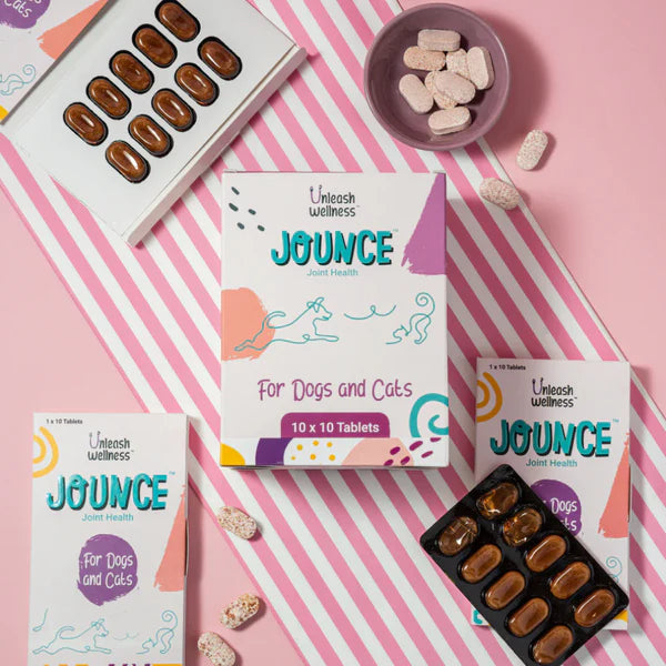 Jounce Hip and Joint Chews are an excellent addition to your pet's daily routine, especially in cases of hip dysplasia and early osteoarthritis. While not a cure, these chews help manage symptoms and improve joint comfort. Each chew contains 600 mg of glucosamine to protect and stimulate cartilage growth, along with curcumin for anti-inflammatory support, providing relief from joint pain. Enriched with chondroitin, hyaluronic acid, and MSM, Jounce promotes flexibility, making it ideal for managing hip and joint disorders. With great palatability, it's a smart choice for long-term joint care.