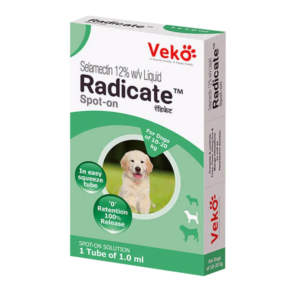 Veko Radicate is a topical spot-on solution for dogs containing selamectin. It is used to kill fleas, ticks, heartworms, roundworms, hookworms, ear mites, and sarcoptic mange in dogs. It is applied to the skin once a month.