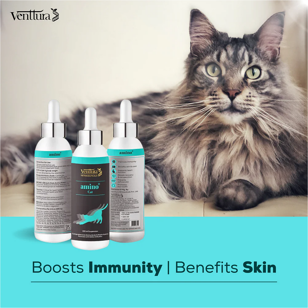 Venttura amino+ Cat, is a specialized nutritional supplement designed to support the health and vitality of cats. This formula is rich in Essential Amino Acids (EAAs) and Branch Chain Amino Acids (BCAAs), essential for feline nutrition. EAAs are crucial as they cannot be synthesized by the cat's body and must be obtained through diet, supporting various functions including muscle repair, immune function, and coat health. BCAAs play a pivotal role in stimulating protein synthesis, aiding in muscle development and recovery. Additionally, amino+ Cat is fortified with a spectrum of vitamins essential for cats, such as vitamin A for vision health, vitamin D for calcium absorption, and vitamin E for antioxidant support. These vitamins collectively contribute to overall well-being by supporting metabolic processes, immune system function, and the maintenance of healthy skin and fur. Venttura's commitment to quality ensures that amino+ Cat provides comprehensive nutritional support, promoting a healthy and active lifestyle for your feline companion.