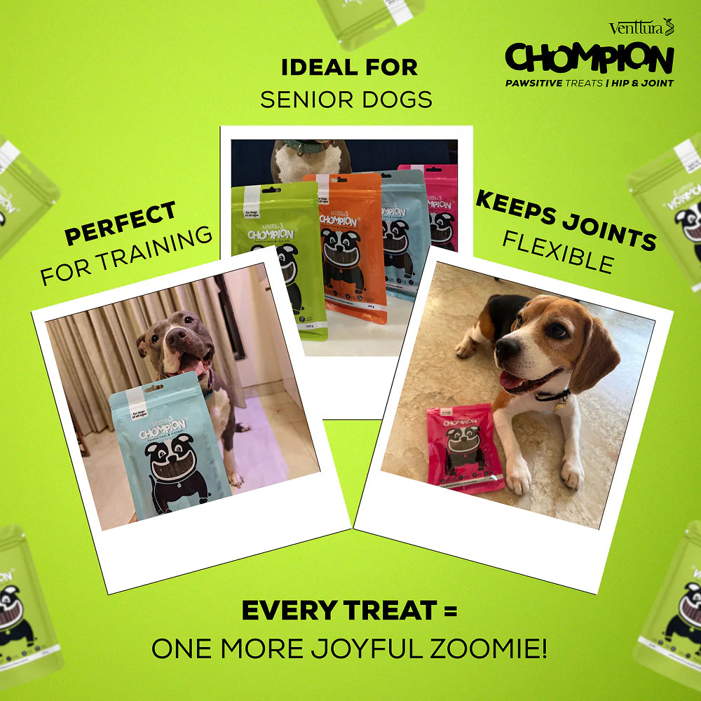 Keep your furry friend playful and fit with Venttura Chompion Hip & Joint Pawsitive Treats! Made with Fresh Chicken, Glucosamine, Chondroitin, Collagen and Herbal Extracts, these functional dog treats promote joint mobility, cartilage repair, and flexibility. The powerful blend of Withania somnifera, Boswellia serrata, and Bromelain provides natural anti-inflammatory and analgesic benefits, helping to ease stiffness and discomfort. Made with human-grade ingredients, these grain-free dog treats are free from artificial flavors and preservatives, making them a healthy and delicious choice for dogs of all ages. Whether used as a training treat or a daily reward, these nutritious and chompilicious chews support your pup’s active lifestyle and keep tails wagging