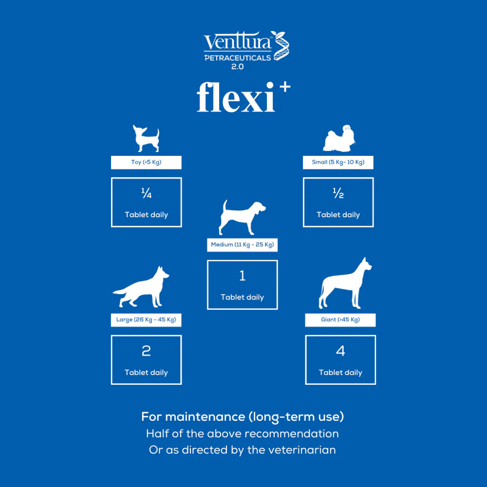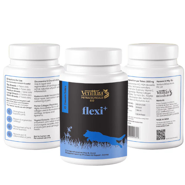 Venttura Flexi+, a comprehensive hip and joint supplement designed to protect and repair joints while improving mobility for your beloved pet. Joints play a crucial role in your pet's skeletal system, experiencing normal wear and tear on a daily basis. Venttura Flexi+ is a potent formula enriched with beneficial nutrients like Marine Collagen Peptides, Glucosamine, Chondroitin, MSM, and herbal extracts. These ingredients work synergistically to repair and nourish cartilage, reduce inflammation and pain in affected joints, and combat the harmful effects of oxidative stress, providing crucial support and joint protection. For enhanced results, consider combining Flexi+ with Omega+, a complementary supplement designed to further support joint health and overall well-being. With the combined benefits of Flexi+ and Omega+, your pet can experience improved joint function, increased mobility, and greater comfort in their daily activities. Invest in your pet's long-term joint health and mobility with Venttura Flexi+ and Omega+, providing them with the care and support they deserve for a happy and active life.