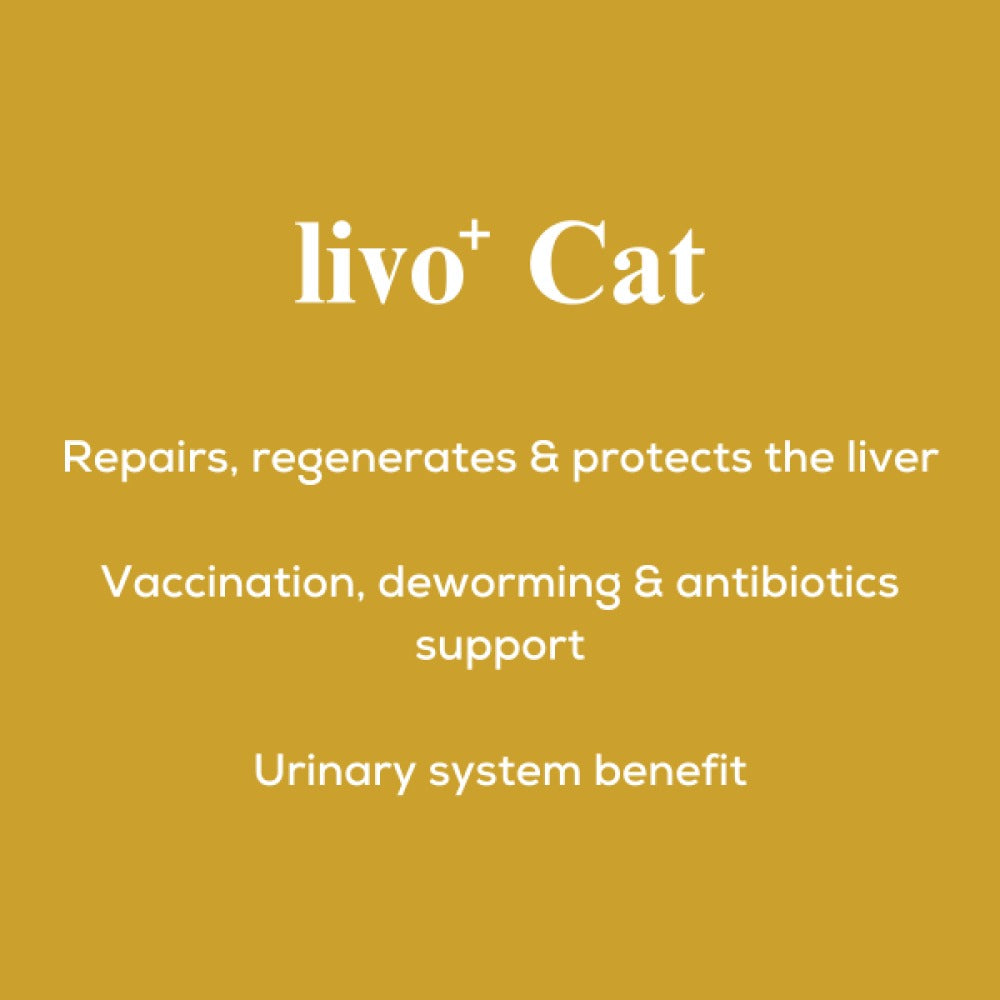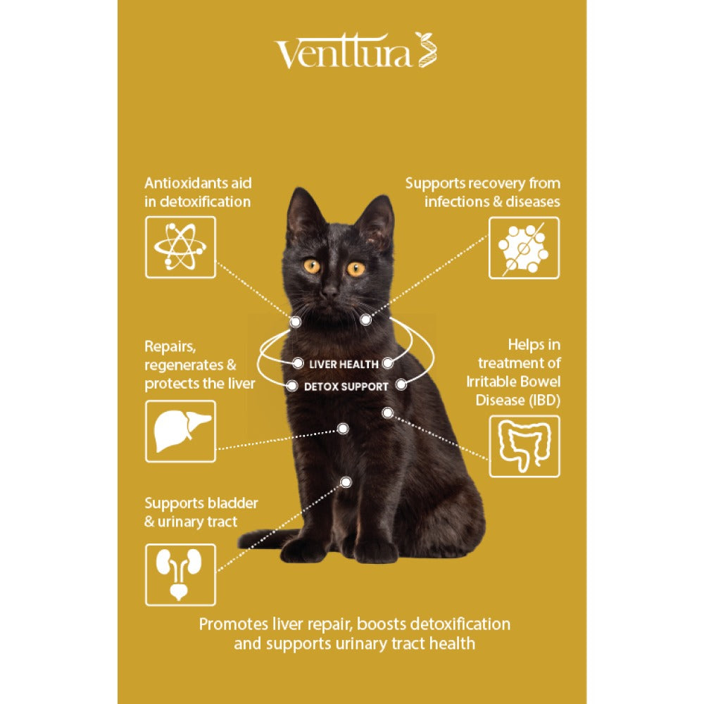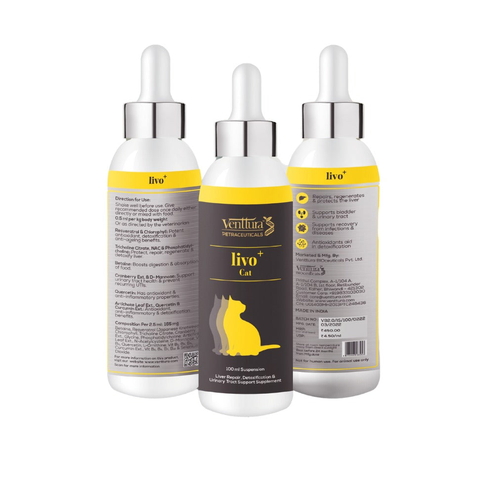 Venttura livo+ Cat is a premium liver support supplement made specifically for cats. It is meticulously crafted to enhance feline health. It provides a complete spectrum of nutrients essential for protecting and repairing liver function, vital for maintaining overall well-being. This advanced formula supports liver repair processes and promotes optimal liver functioning, ensuring your cat's health is in top condition. The liver is one of the largest organs in the body and performs multiple functions- digestion & conversion of nutrients, removal of toxins, storage of vitamins, minerals & glycogen, metabolism of drugs, etc. Liver function can be compromised due to various causes. livo+ Cat helps in repair & regeneration of the liver, detoxification and improving liver function. livo+ Cat has nutrients that benefit the urinary tract and reduce the instances of urinary tract infections in cats, contributing to comprehensive wellness. Trusted by pet parents and recommended by veterinarians, Venttura livo+ Cat is formulated to support liver health and urinary tract function effectively. Whether your cat needs ongoing support or as a proactive measure, this supplement is ideal for enhancing their vitality and quality of life. Ensure your feline companion receives the best care with Venttura livo+ Cat, a cornerstone in holistic pet wellness designed to keep them happy and healthy for years to come.
